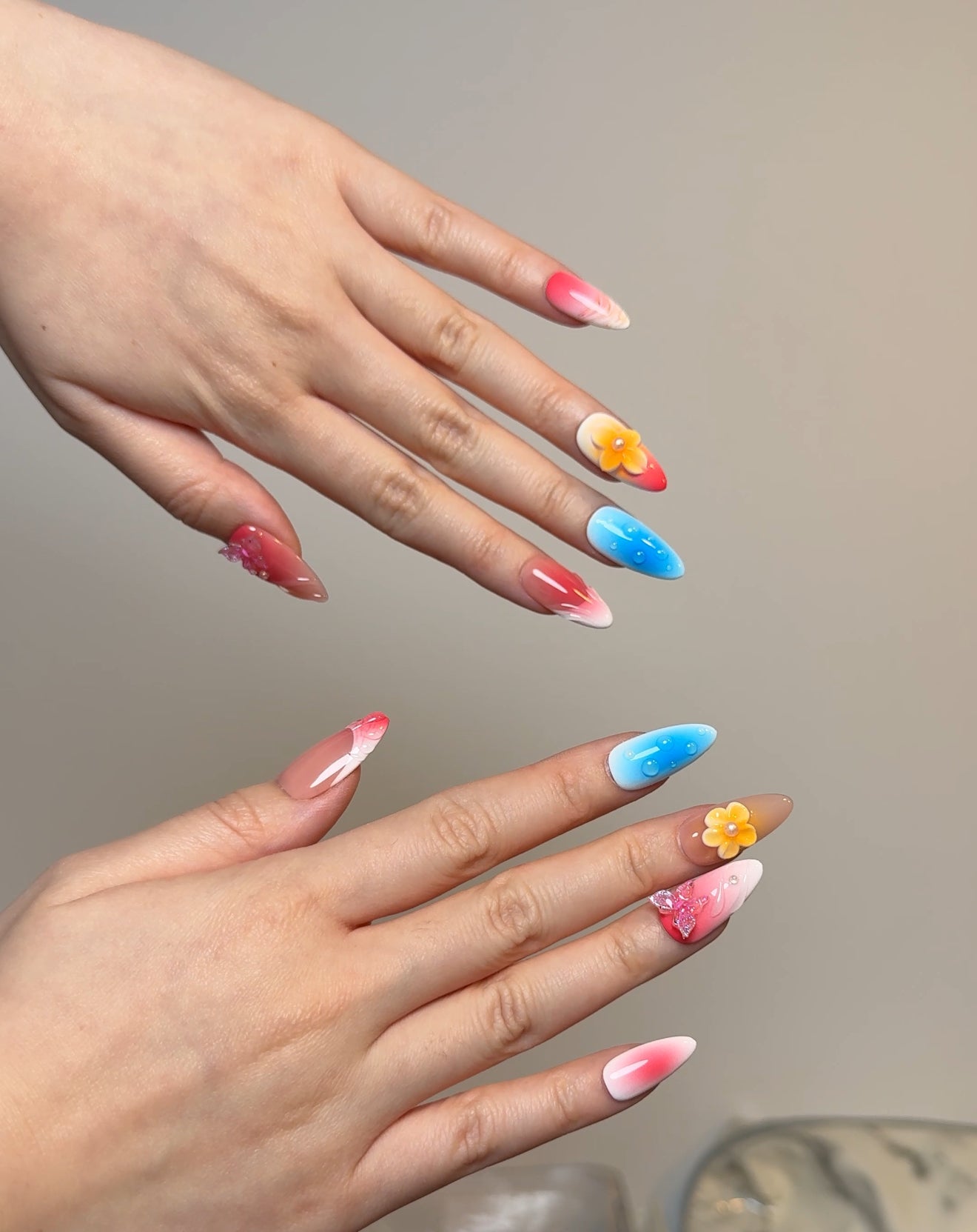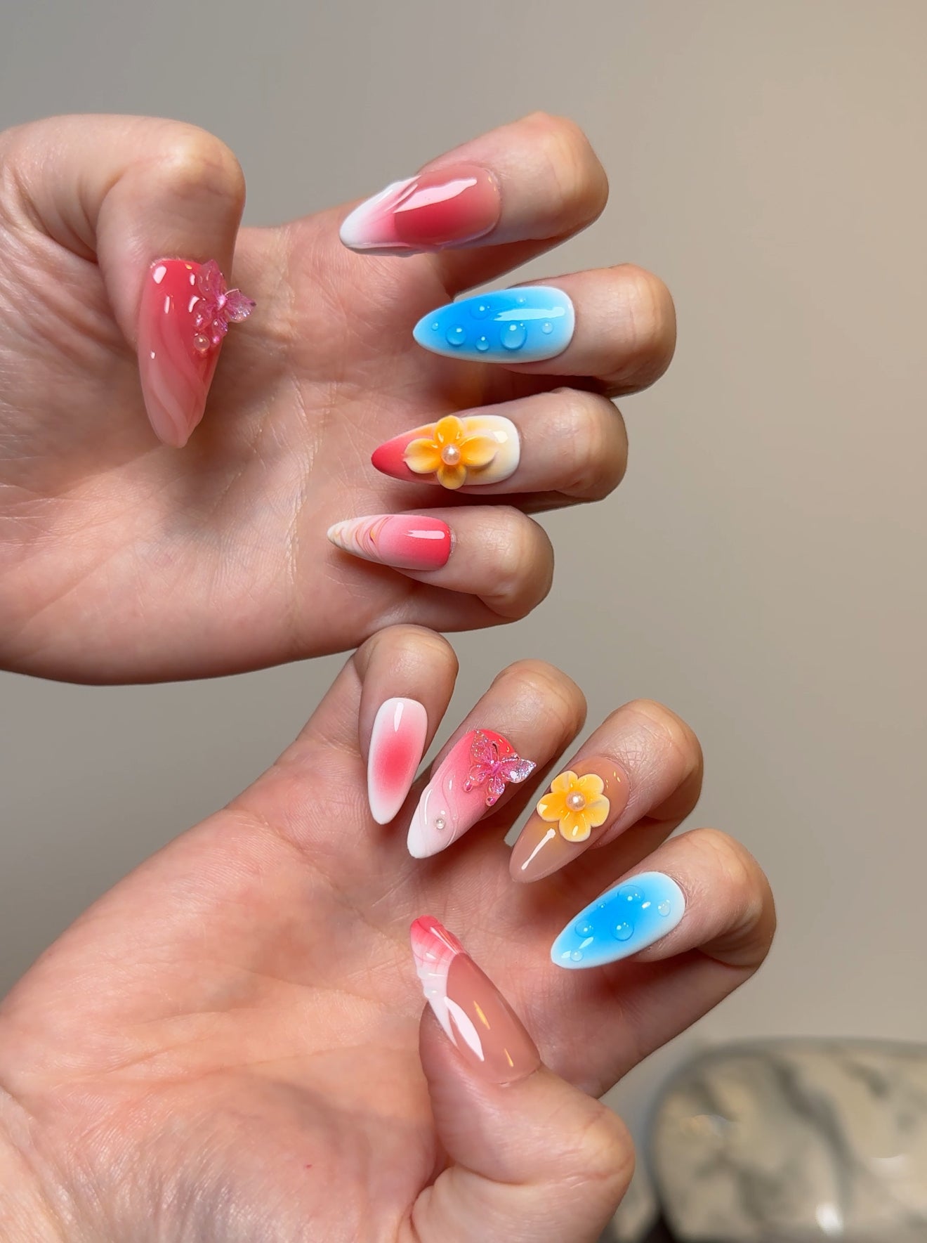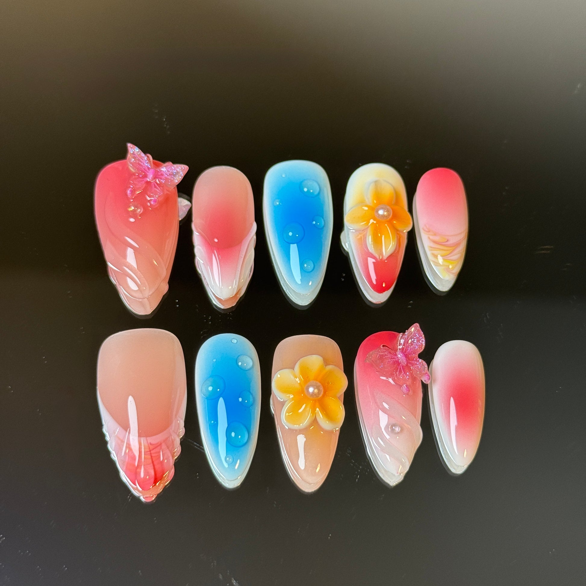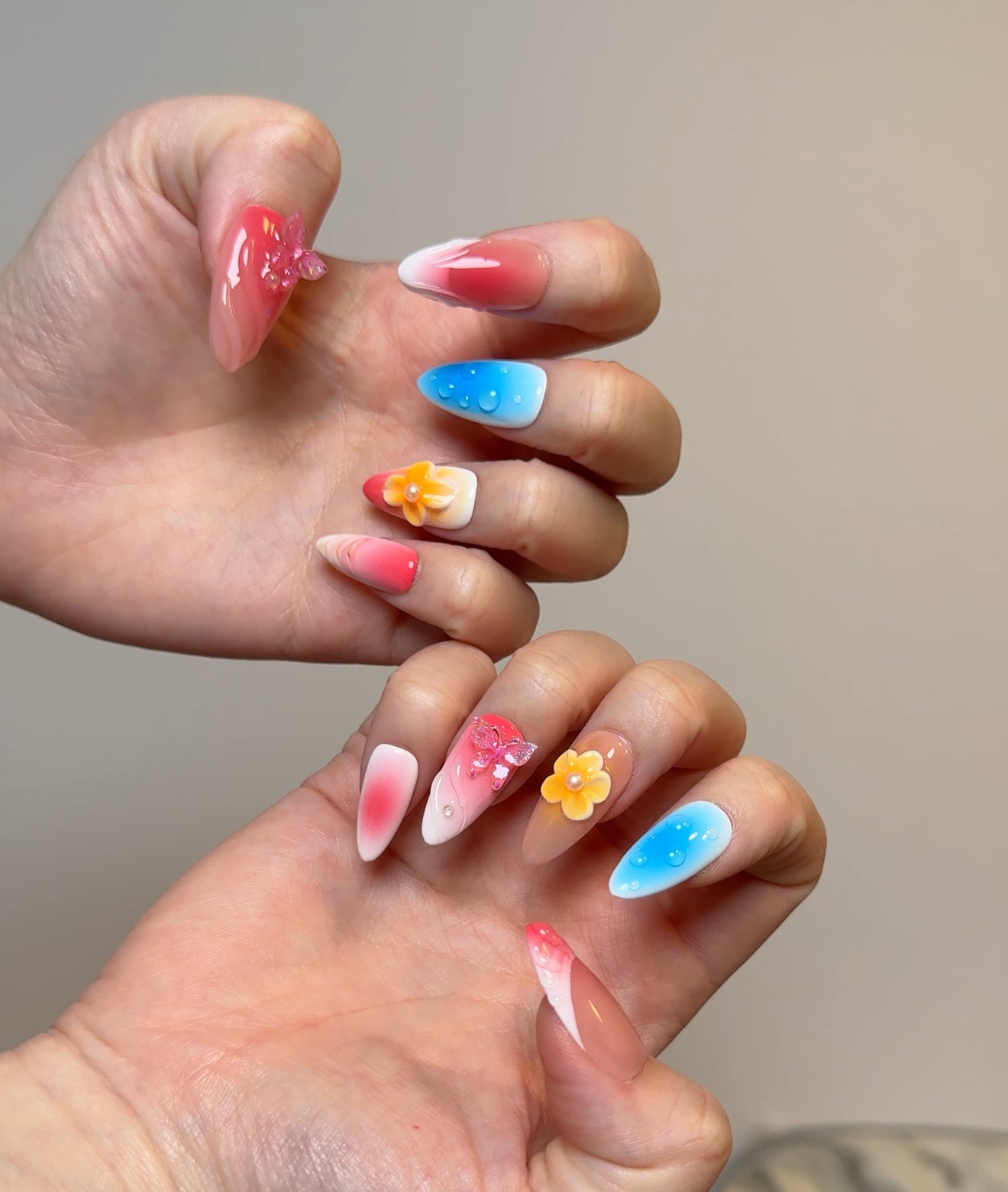 This vibrant press-on nail set captures the beauty of a sunset with its gradient hues of pink, orange, and blue. Each nail features delicate floral and butterfly embellishments, creating a playful and lively look. Perfect for adding a burst of color and charm to your spring and summer outfits.