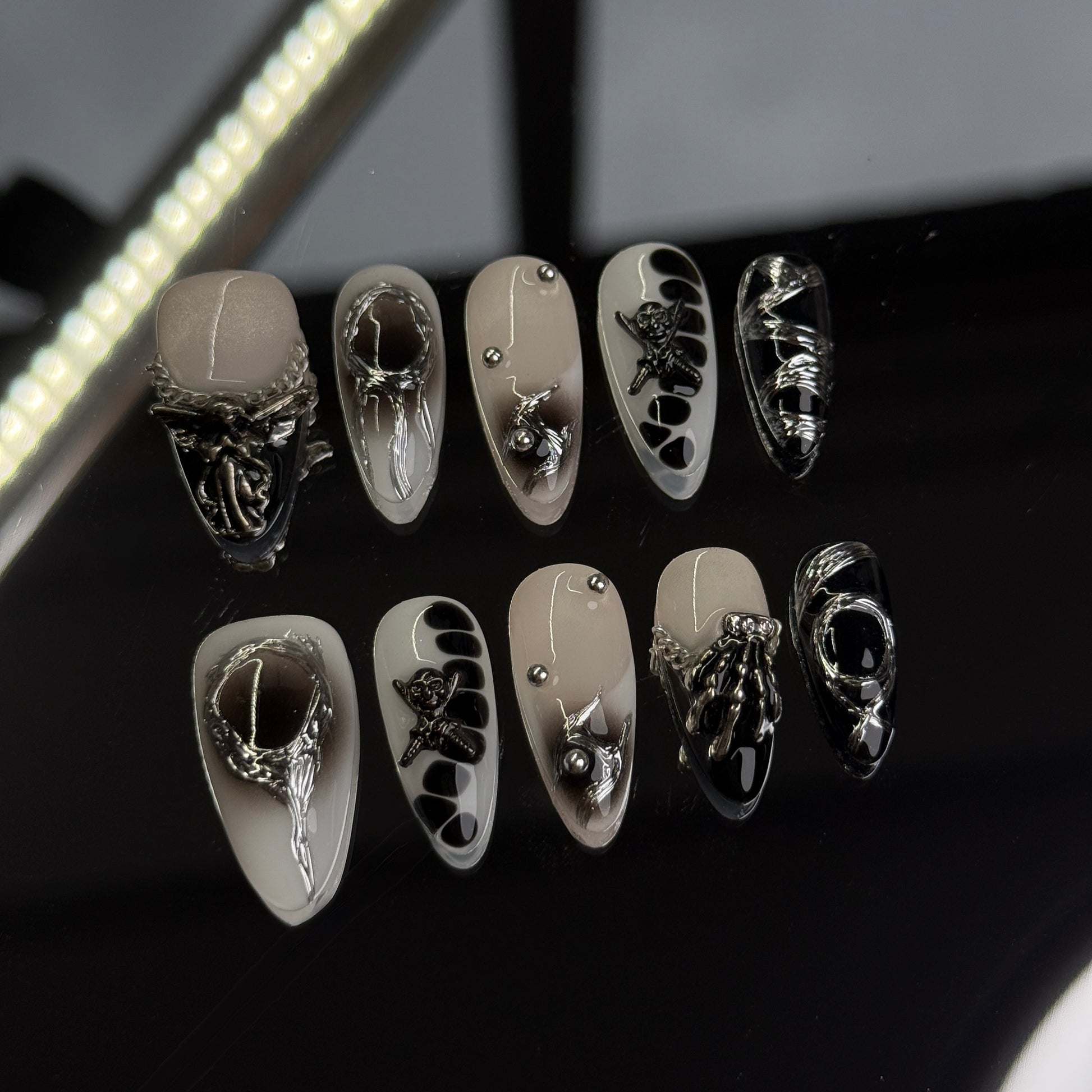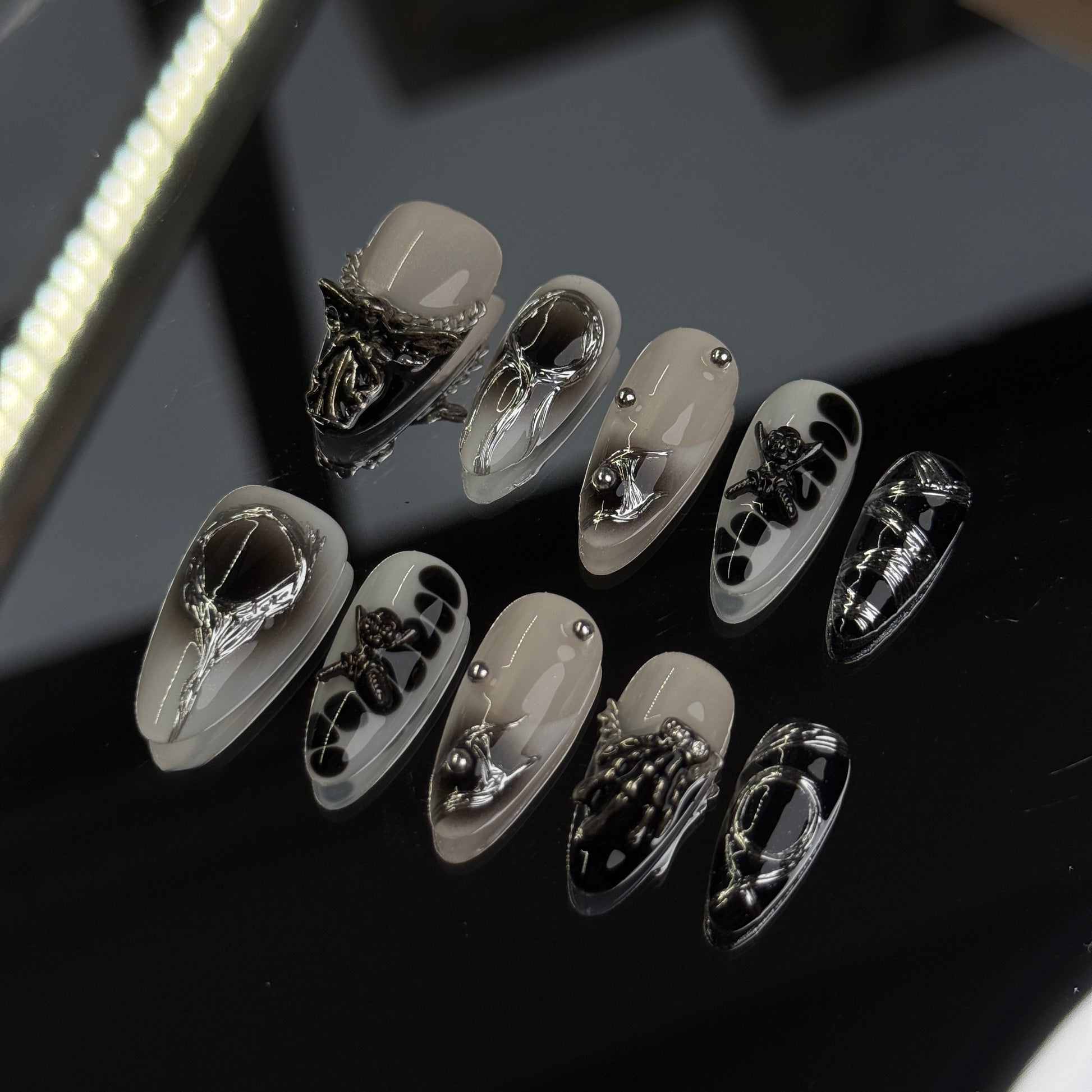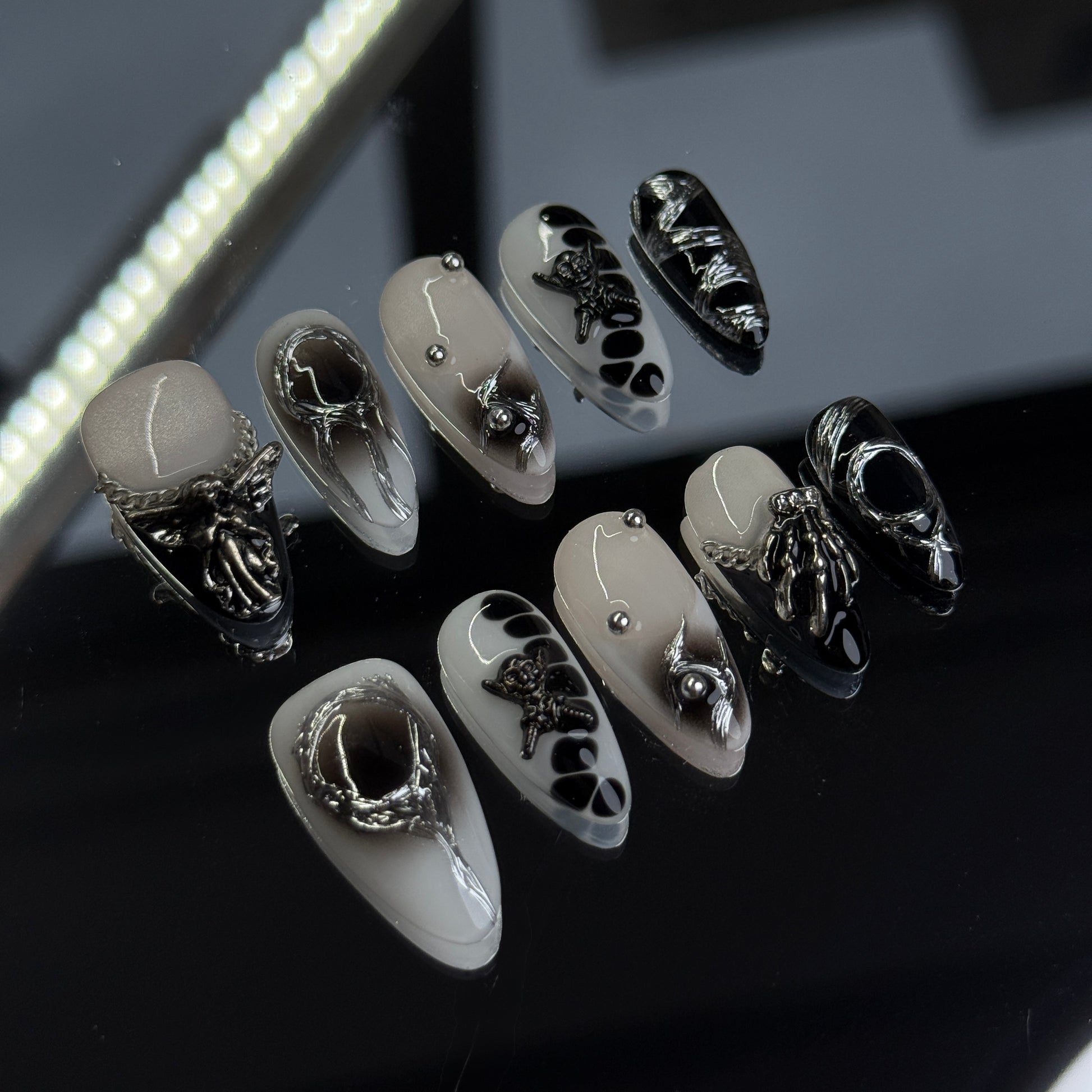 • This nail set exudes a mysterious stype with its glossy black and smoky grey tones. Featuring ornate silver details, intricate spider webs, and pearl embellishments, these nails are perfect for those who love a blend of gothic elegance and enchanting charm.