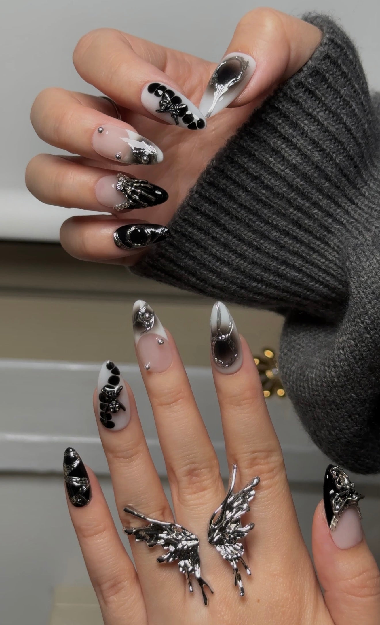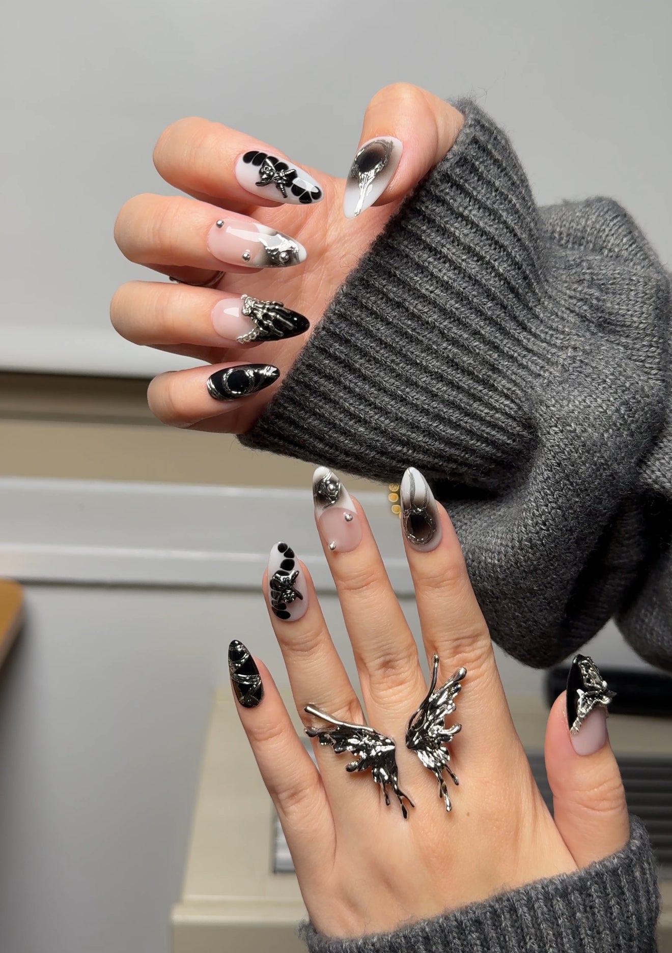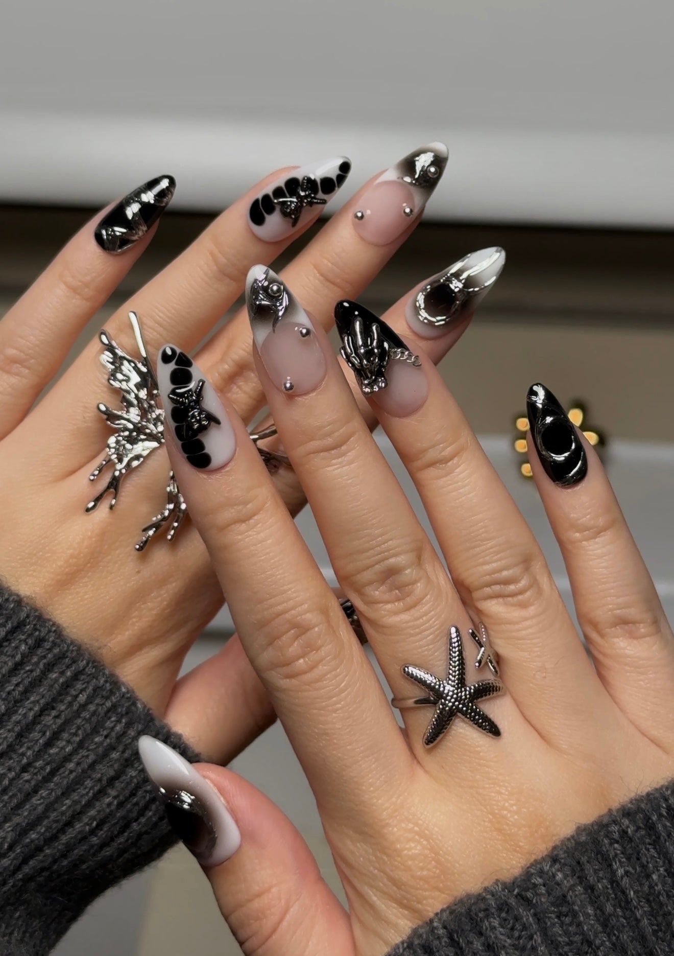 • This nail set exudes a mysterious stype with its glossy black and smoky grey tones. Featuring ornate silver details, intricate spider webs, and pearl embellishments, these nails are perfect for those who love a blend of gothic elegance and enchanting charm.