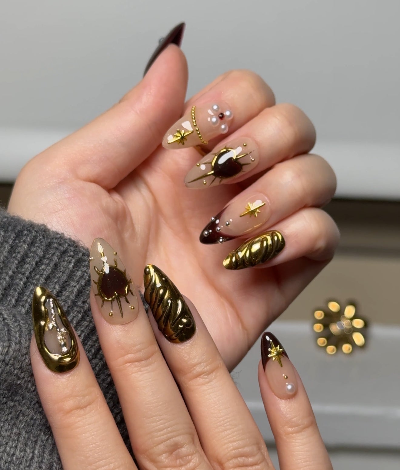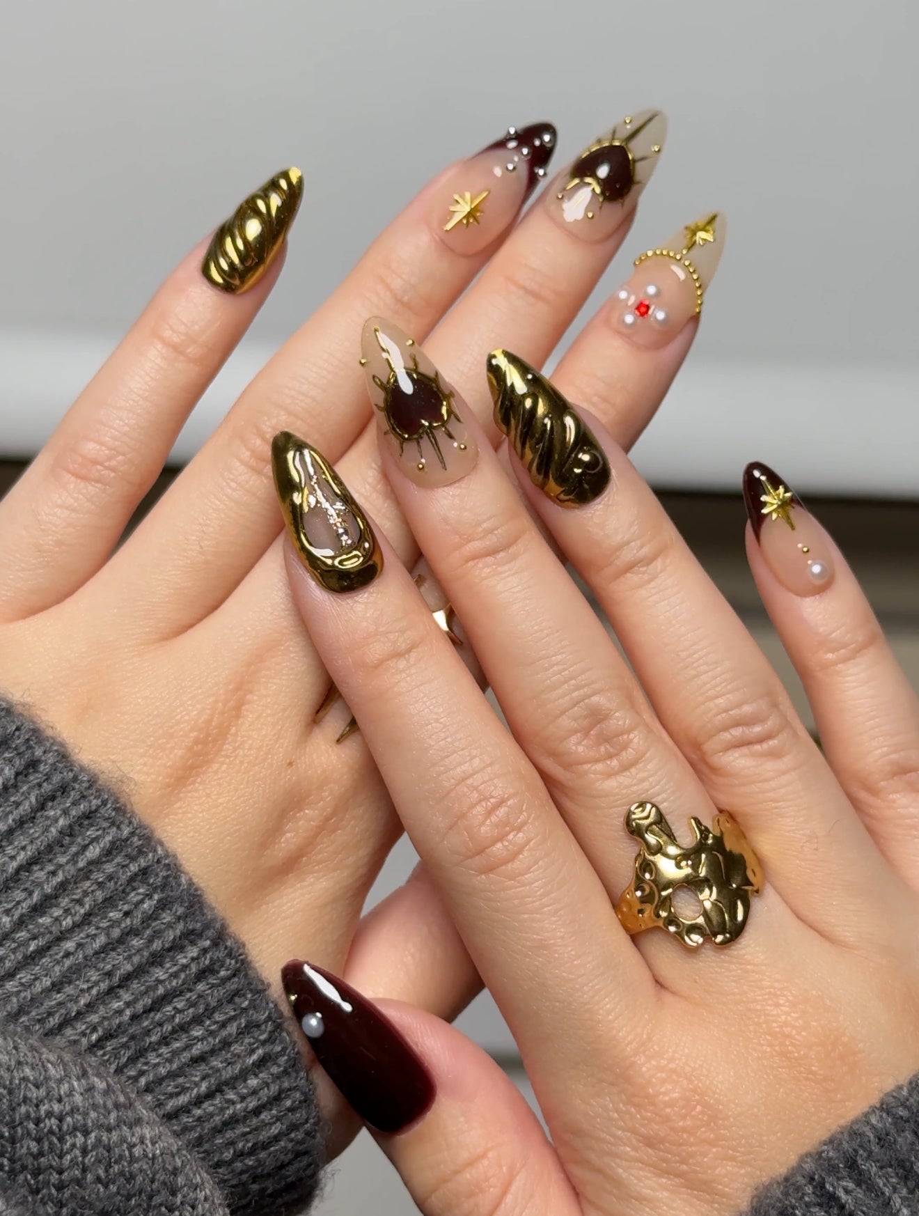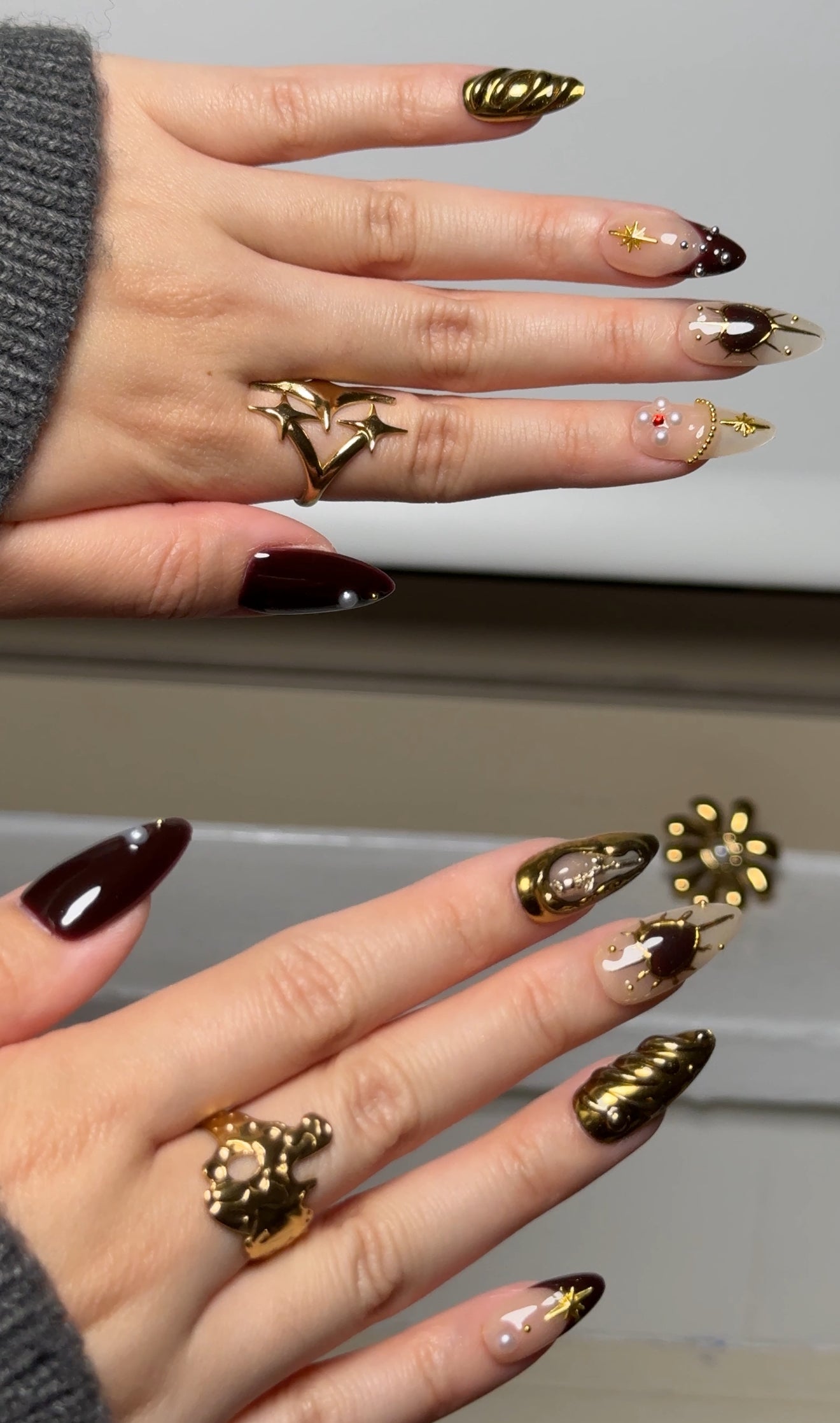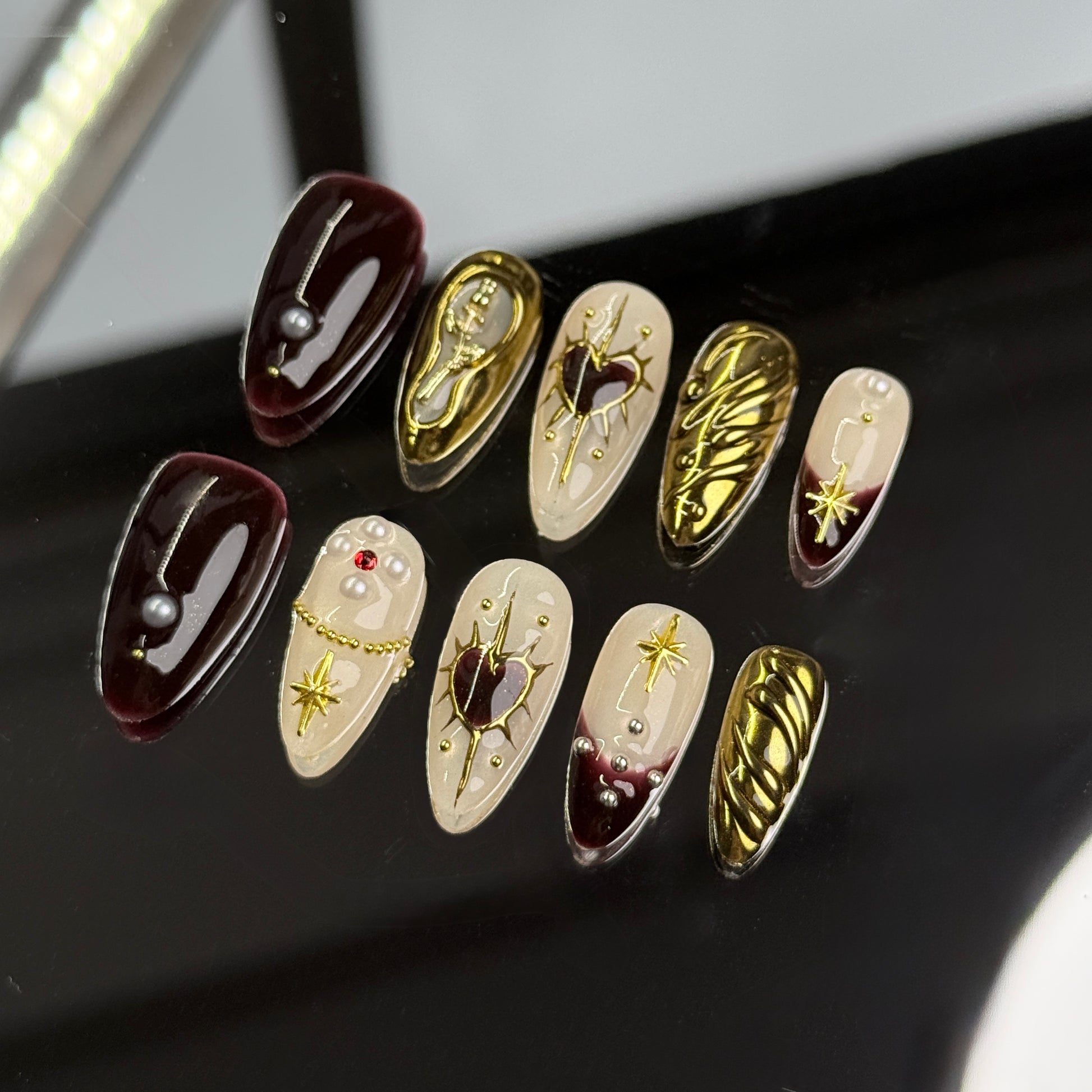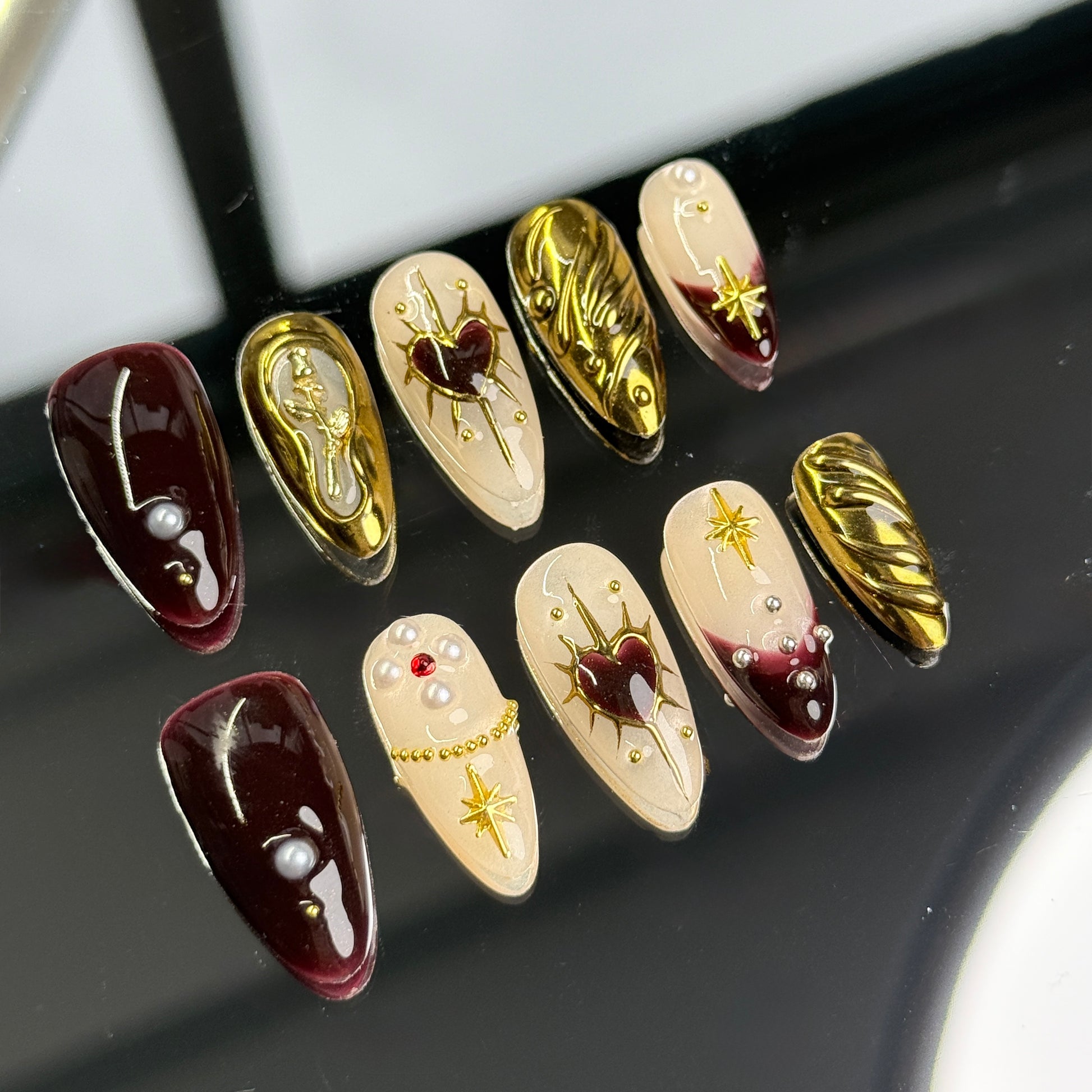 - Indulge in elegance with the "Regal Romance" Nail Set, crafted for those who appreciate luxurious style. These press-on nails feature a rich burgundy and gold palette, adorned with heart motifs, pearls, and star embellishments.