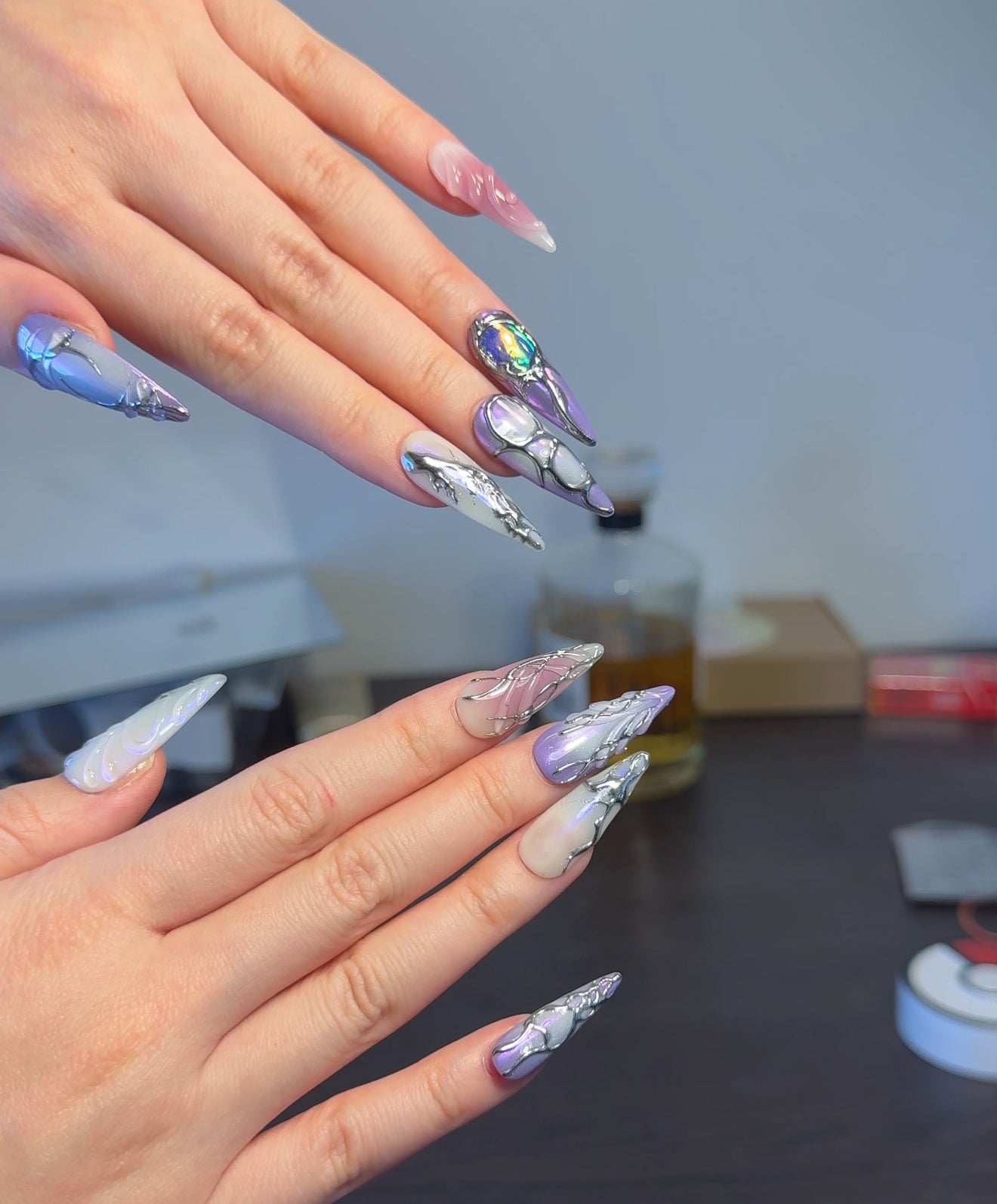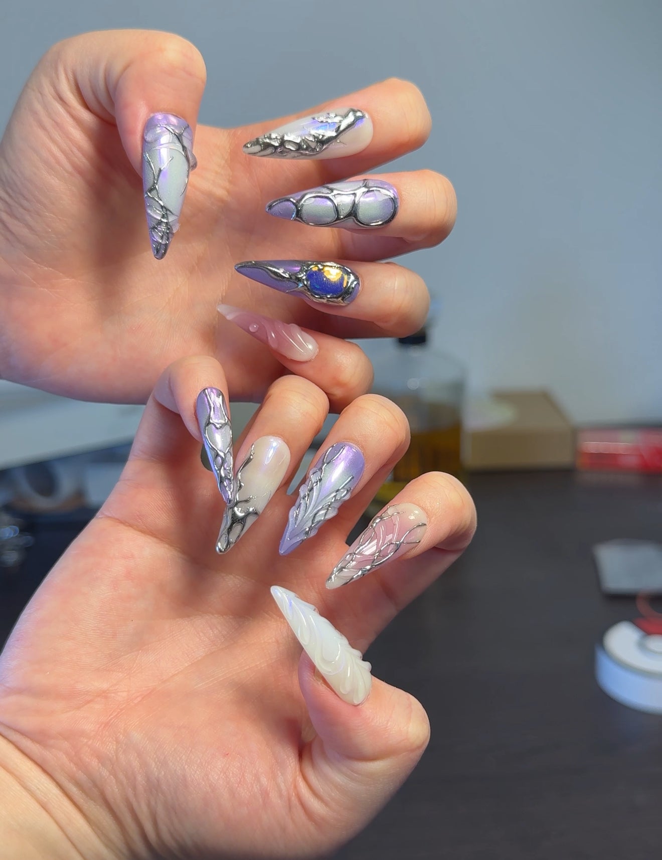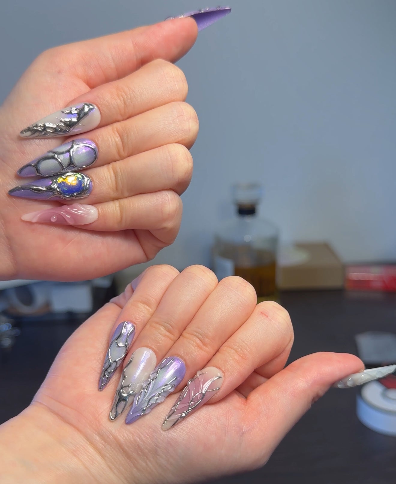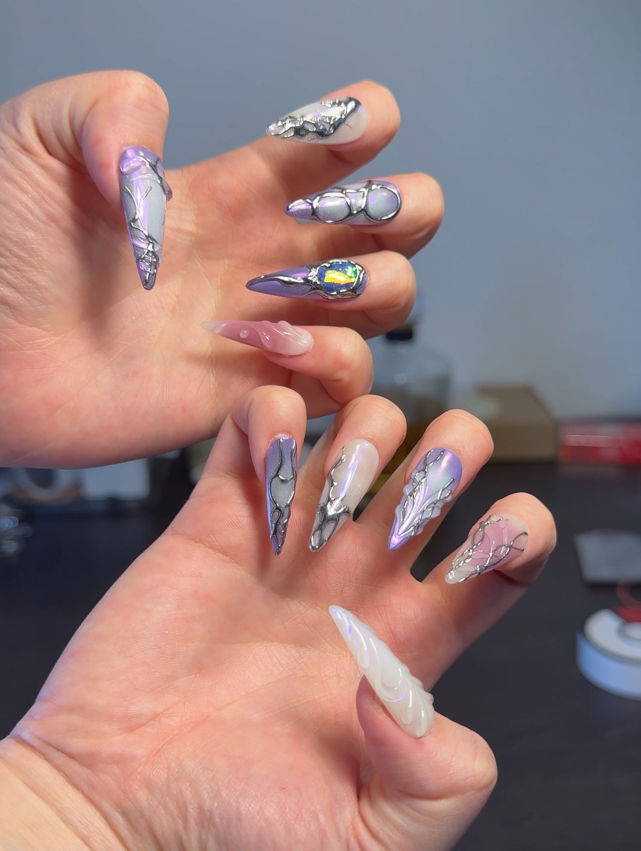 - This nail set exudes a mystical and enchanting vibe with a palette of purple, pink, and white hues. The designs feature intricate silver detailing that resembles vines or abstract patterns. Some nails have a gradient effect, transitioning from purple to pink, while others have elegant swirls. One nail stands out with a bold blue stone embellishment, adding a touch of glamour. The overall look is whimsical and sophisticated, perfect for a dreamy, artistic style.