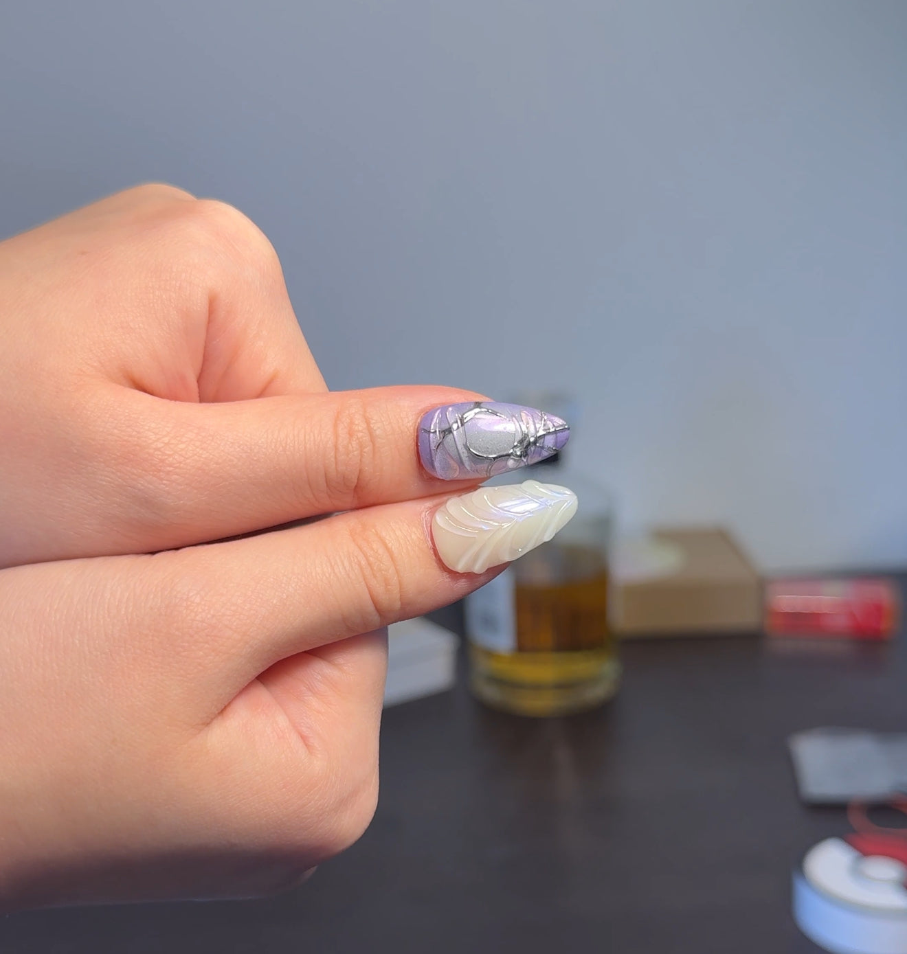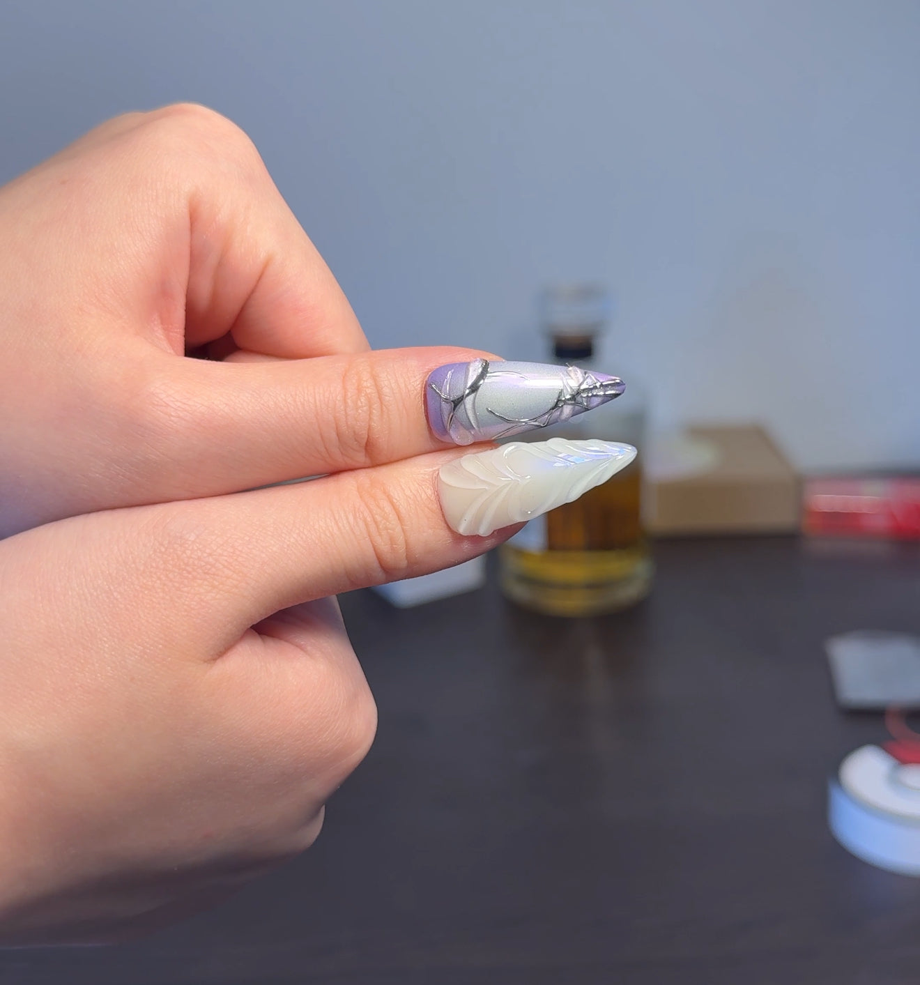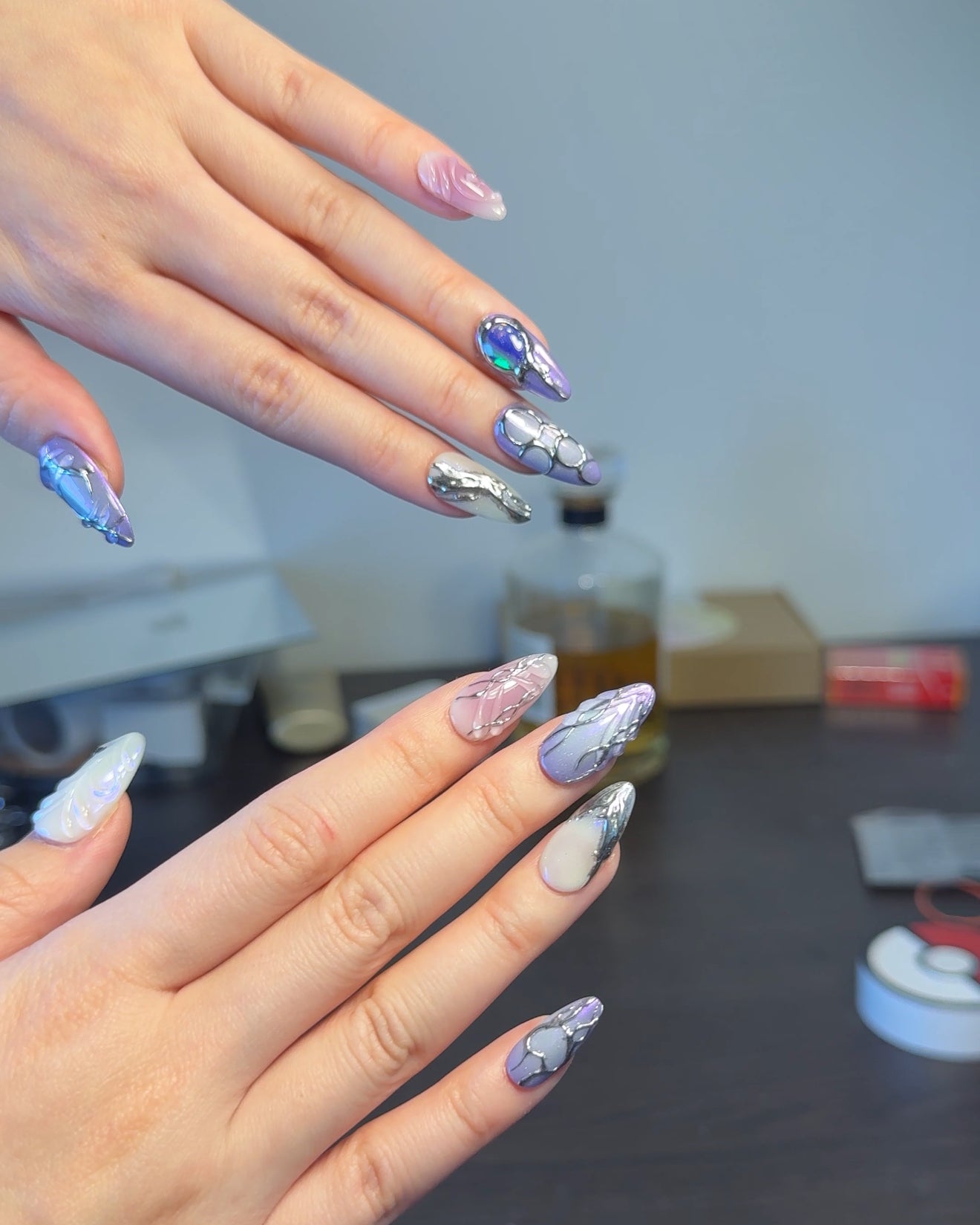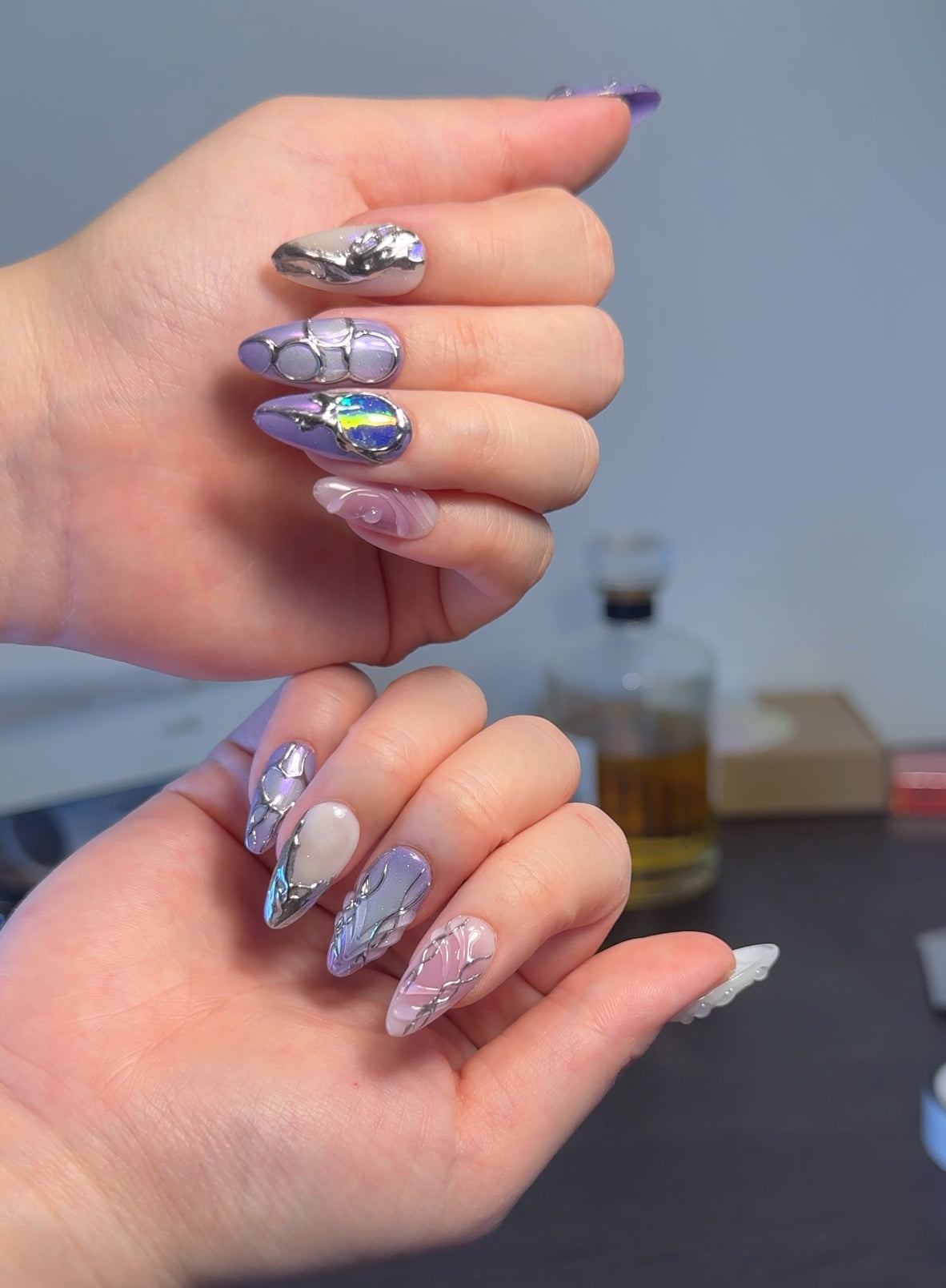 - This nail set exudes a mystical and enchanting vibe with a palette of purple, pink, and white hues. The designs feature intricate silver detailing that resembles vines or abstract patterns. Some nails have a gradient effect, transitioning from purple to pink, while others have elegant swirls. One nail stands out with a bold blue stone embellishment, adding a touch of glamour. The overall look is whimsical and sophisticated, perfect for a dreamy, artistic style.