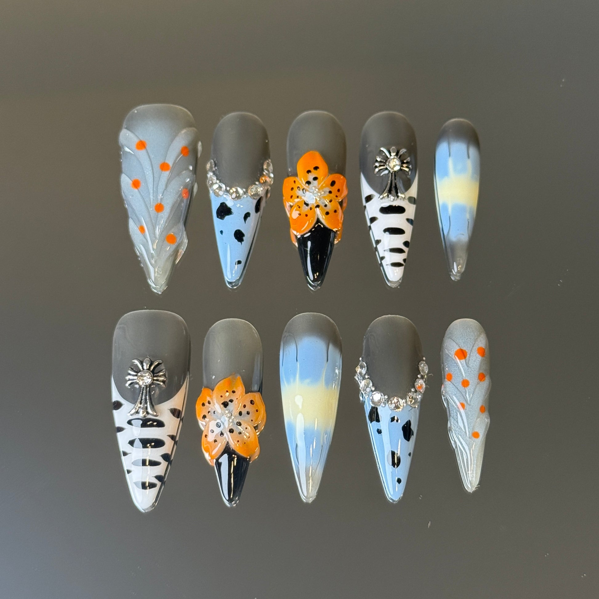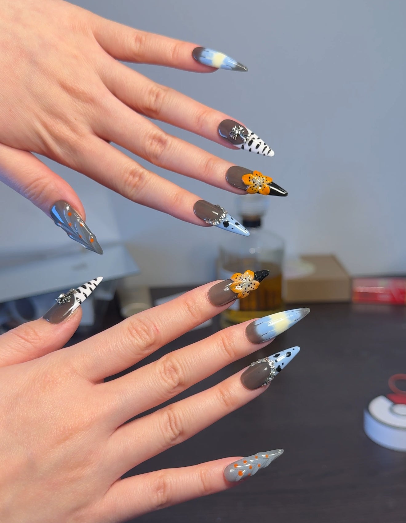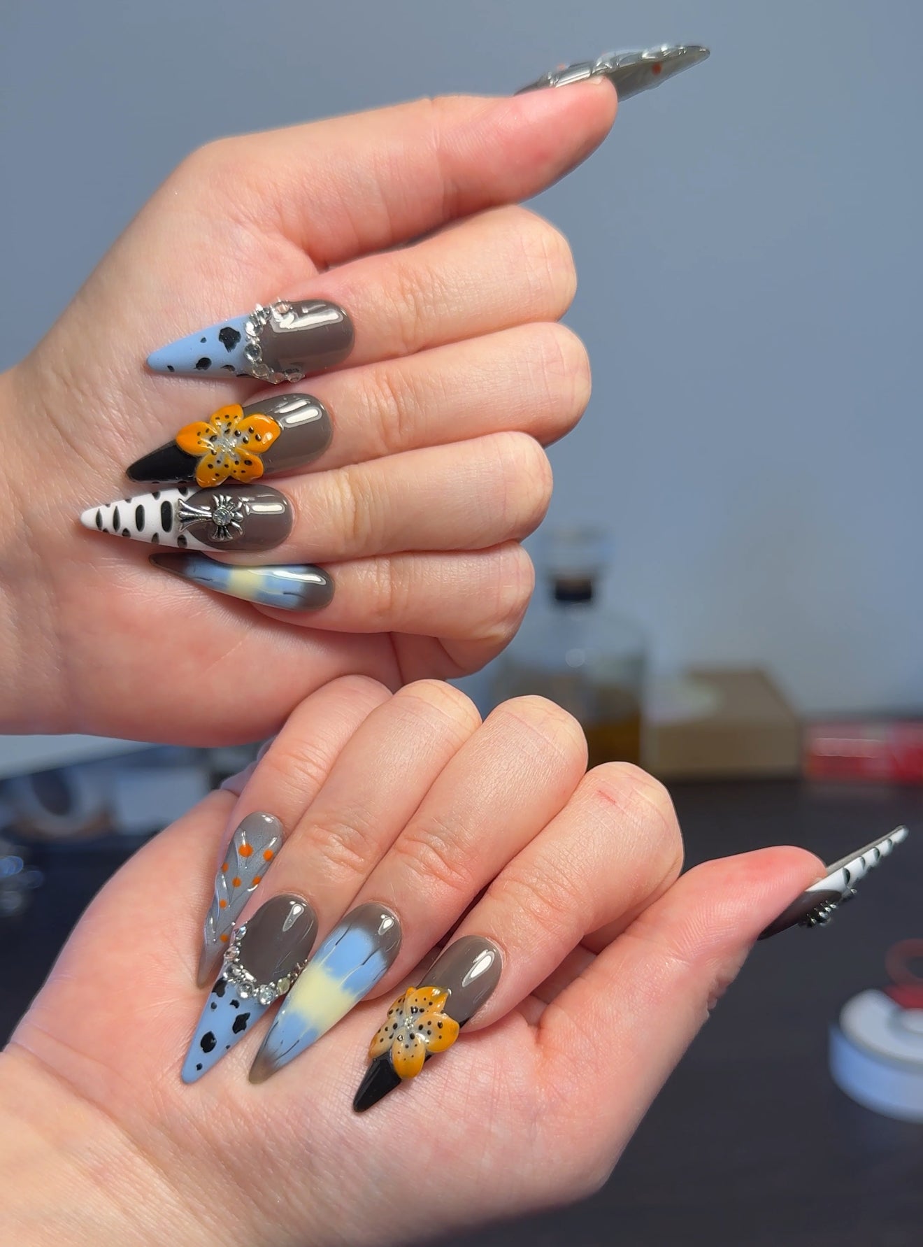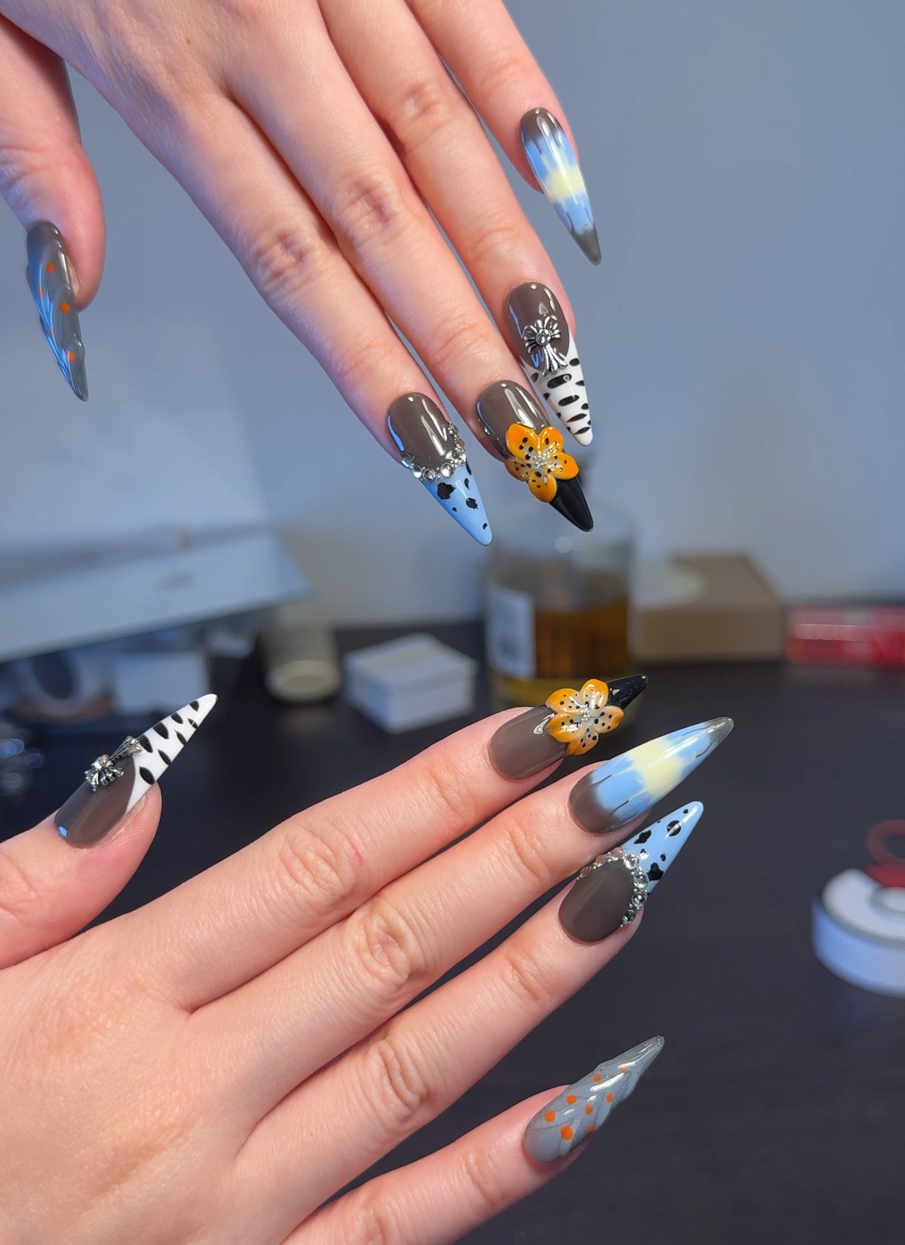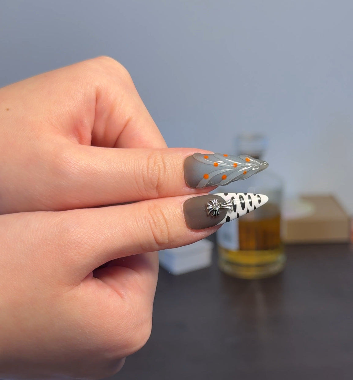 This nail set features a cool and edgy design with shades of blue and white. The nails showcase a flame motif in dark blue against a lighter background, creating a dynamic contrast. Some nails include blue polka dots on a white base, adding a playful touch. One nail is accented with a black chain embellishment, lending a bold and modern flair. The overall aesthetic is striking and contemporary, perfect for a sleek and stylish look.