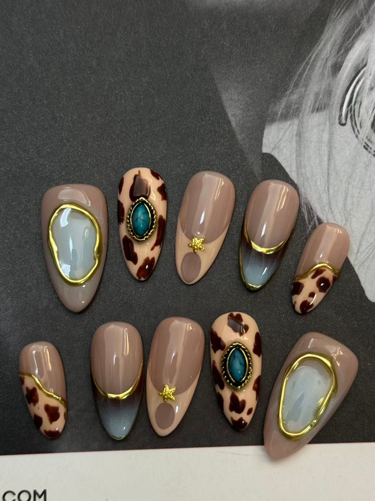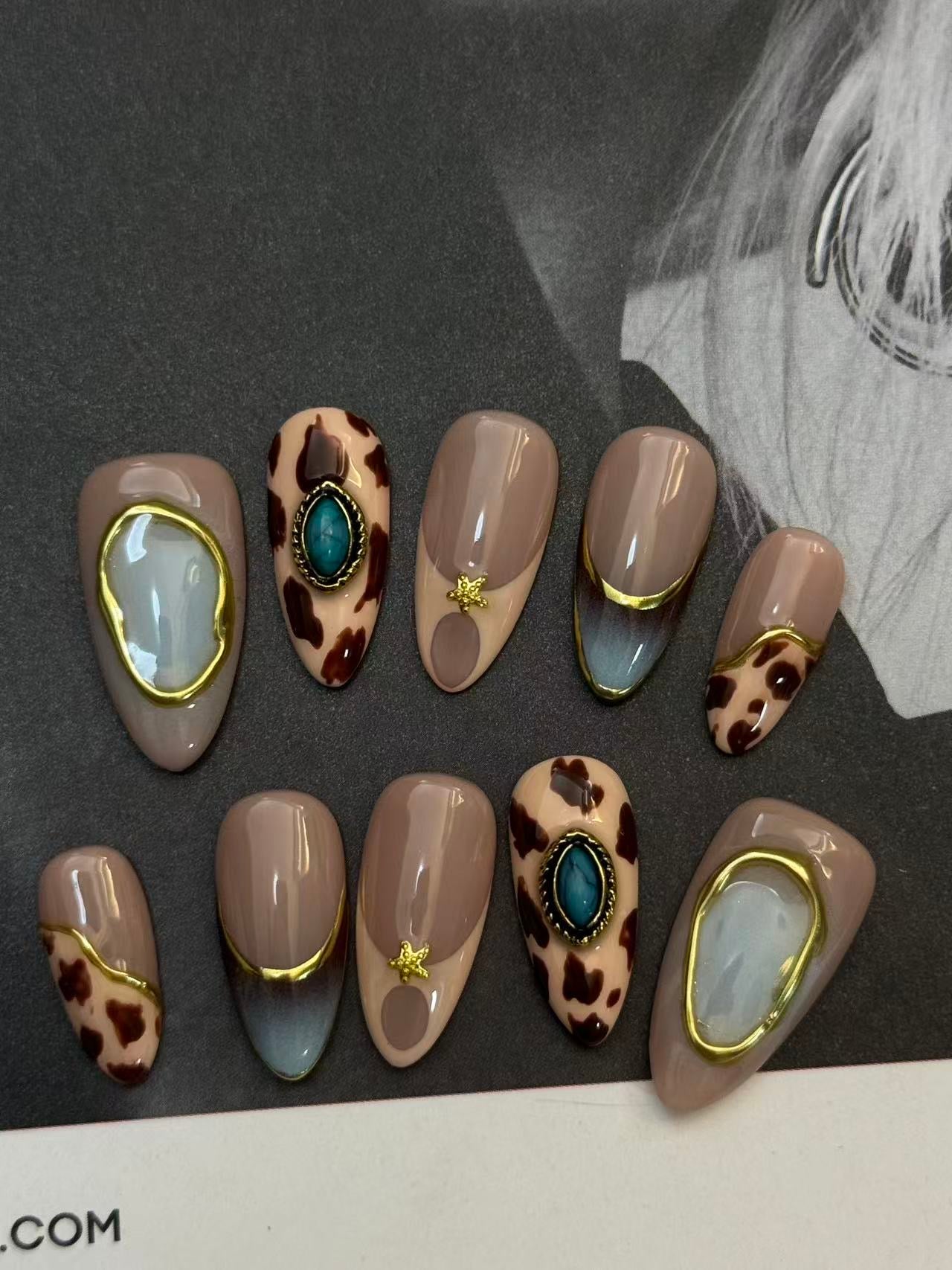 This earthy-chic press-on nail set blends warm taupe bases with cow-print accents, gold framing, and turquoise gemstone embellishments. The subtle gradient tips and mini star charms add just the right amount of personality, making this set perfect for anyone who loves a sophisticated, Western-inspired aesthetic with a touch of glam.