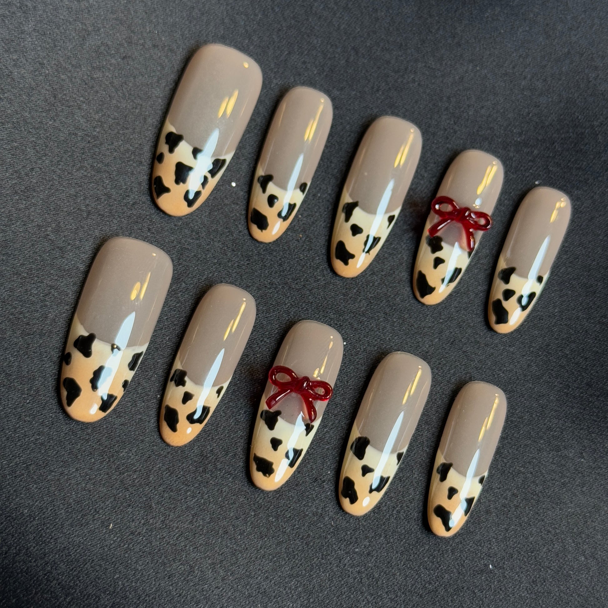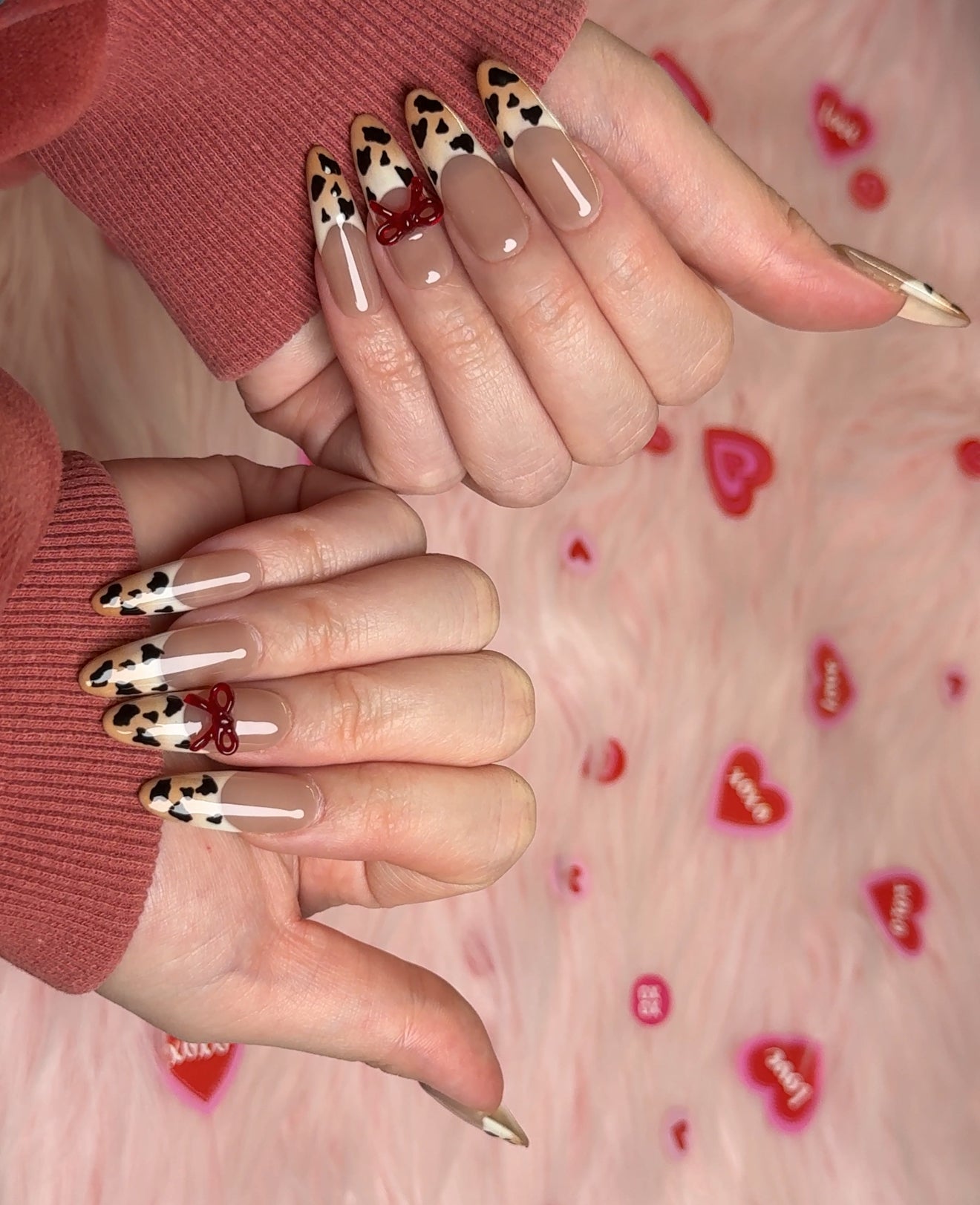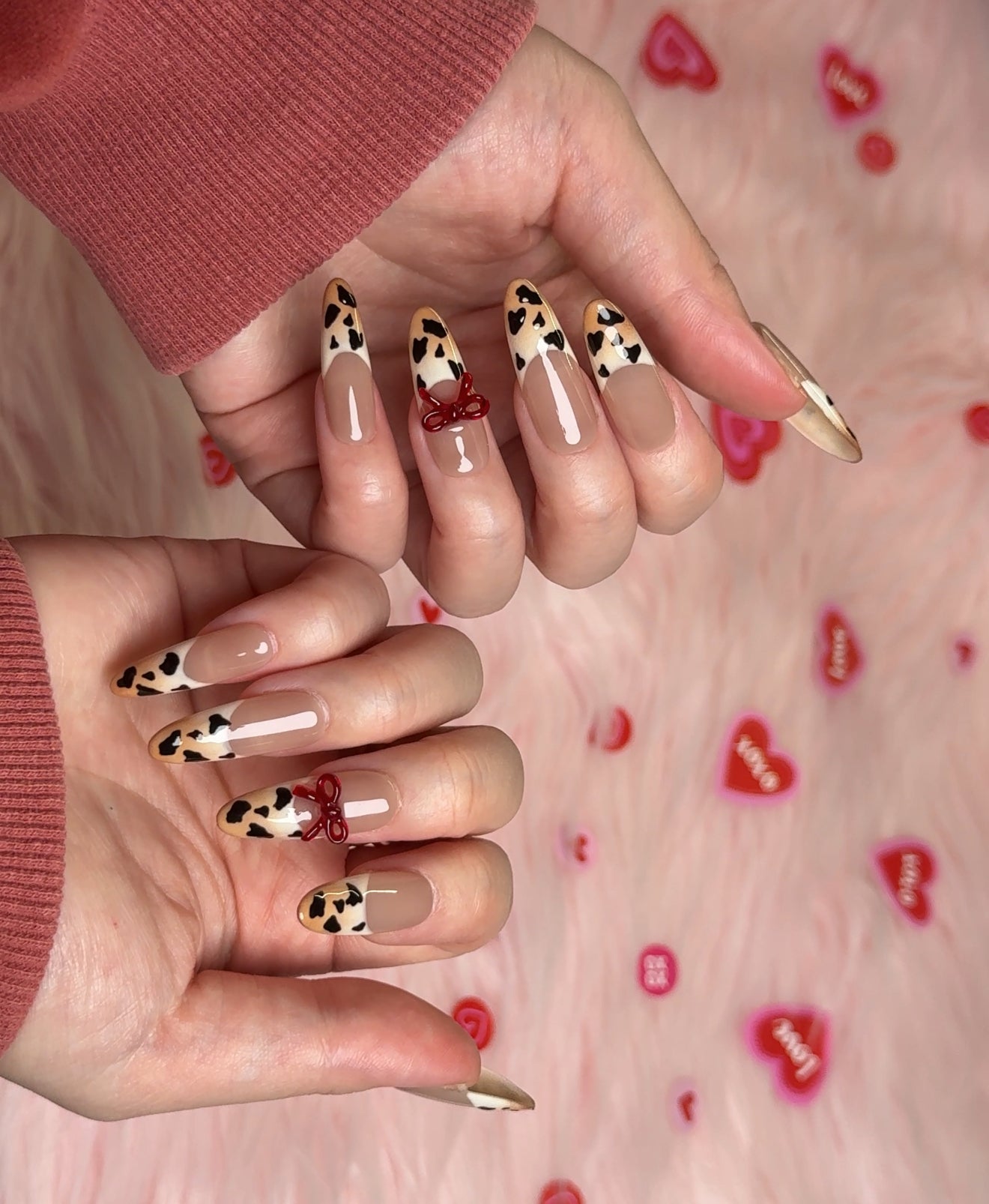 - Charming red hearts, pearls, and delicate bows combined with a soft nude and white base for a romantic touch.
