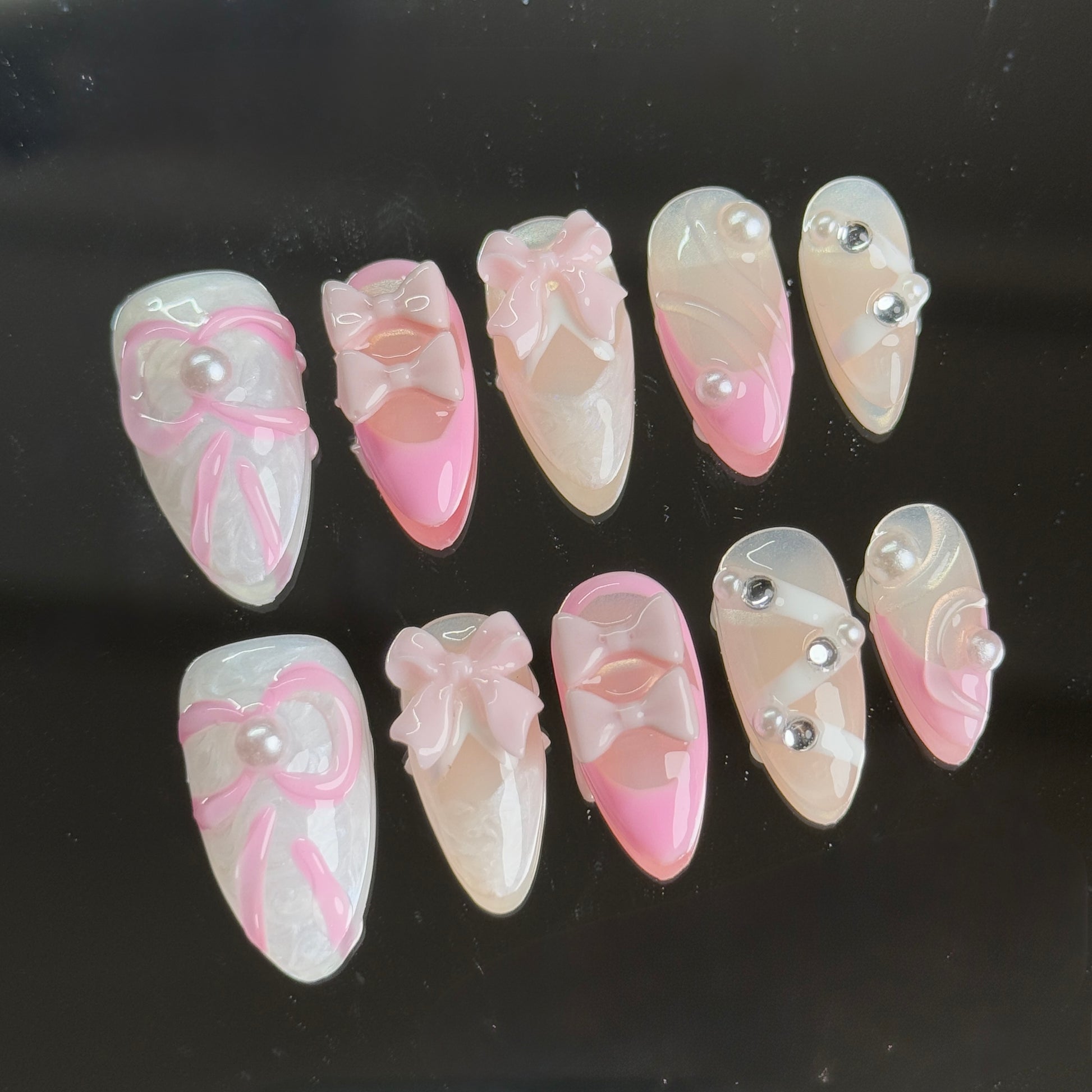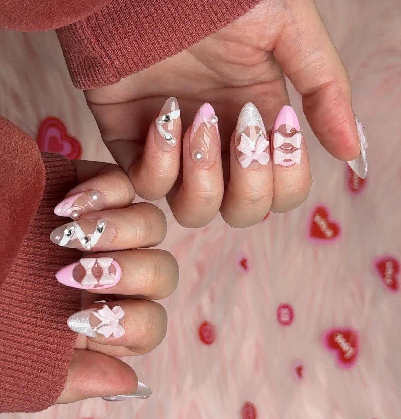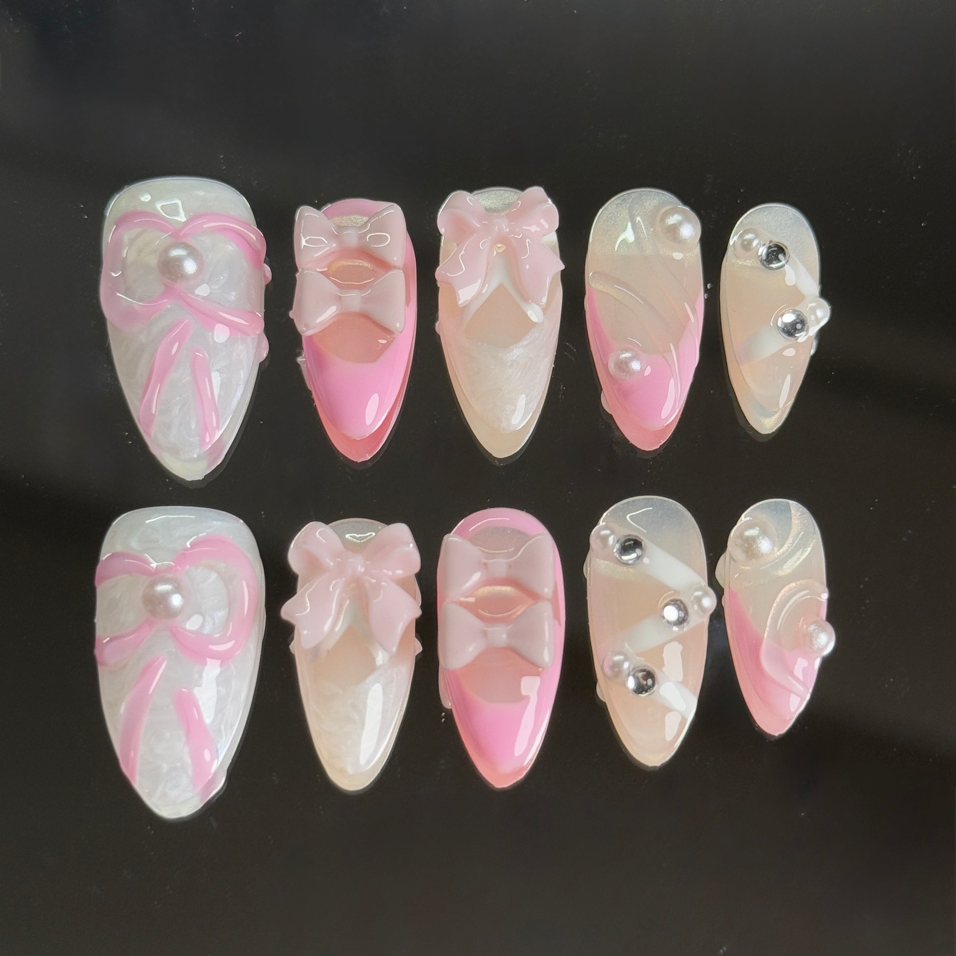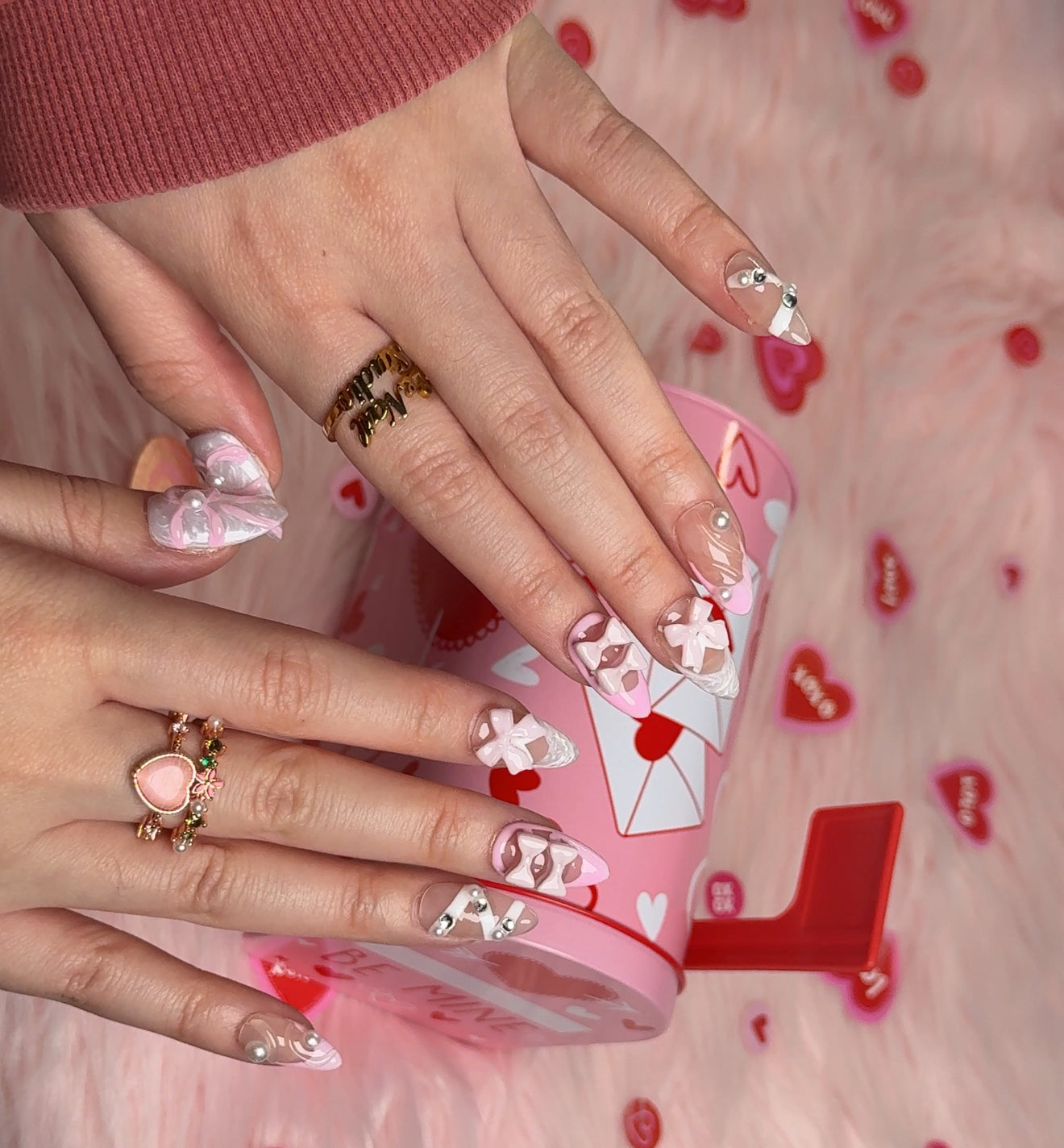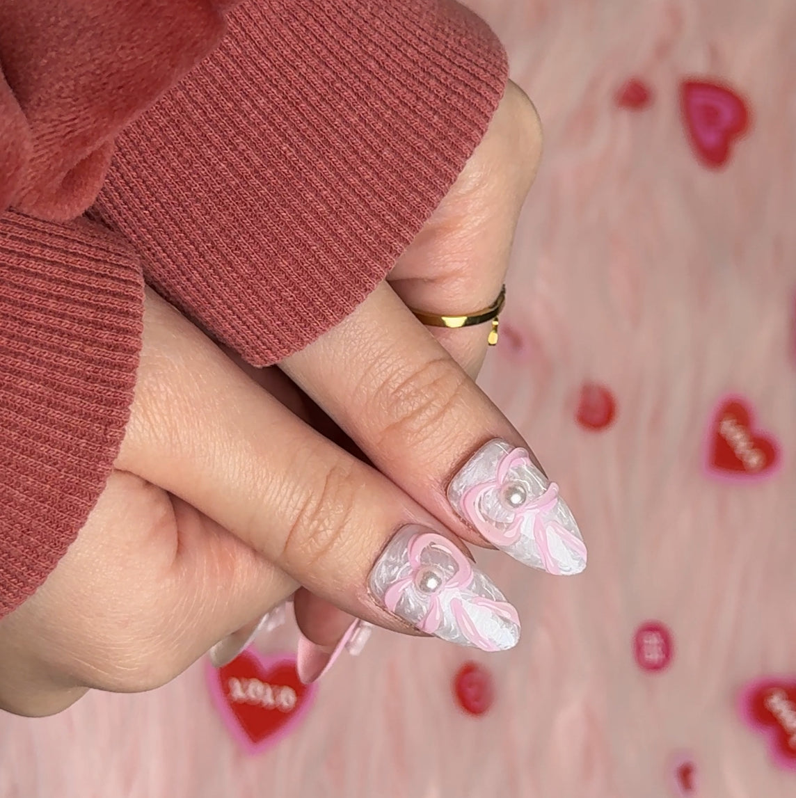 Indulge in elegance this Valentine's Day with our exquisite press-on nail set. Featuring a delicate blend of soft pink and white hues, each nail is adorned with intricate 3D bow designs and shimmering pearls to add a touch of romance and sophistication. Perfect for a special occasion or to elevate your everyday look, these nails are easy to apply and designed for a comfortable fit. Treat yourself or a loved one to this charming manicure set and make a stylish statement this Valentine's season.