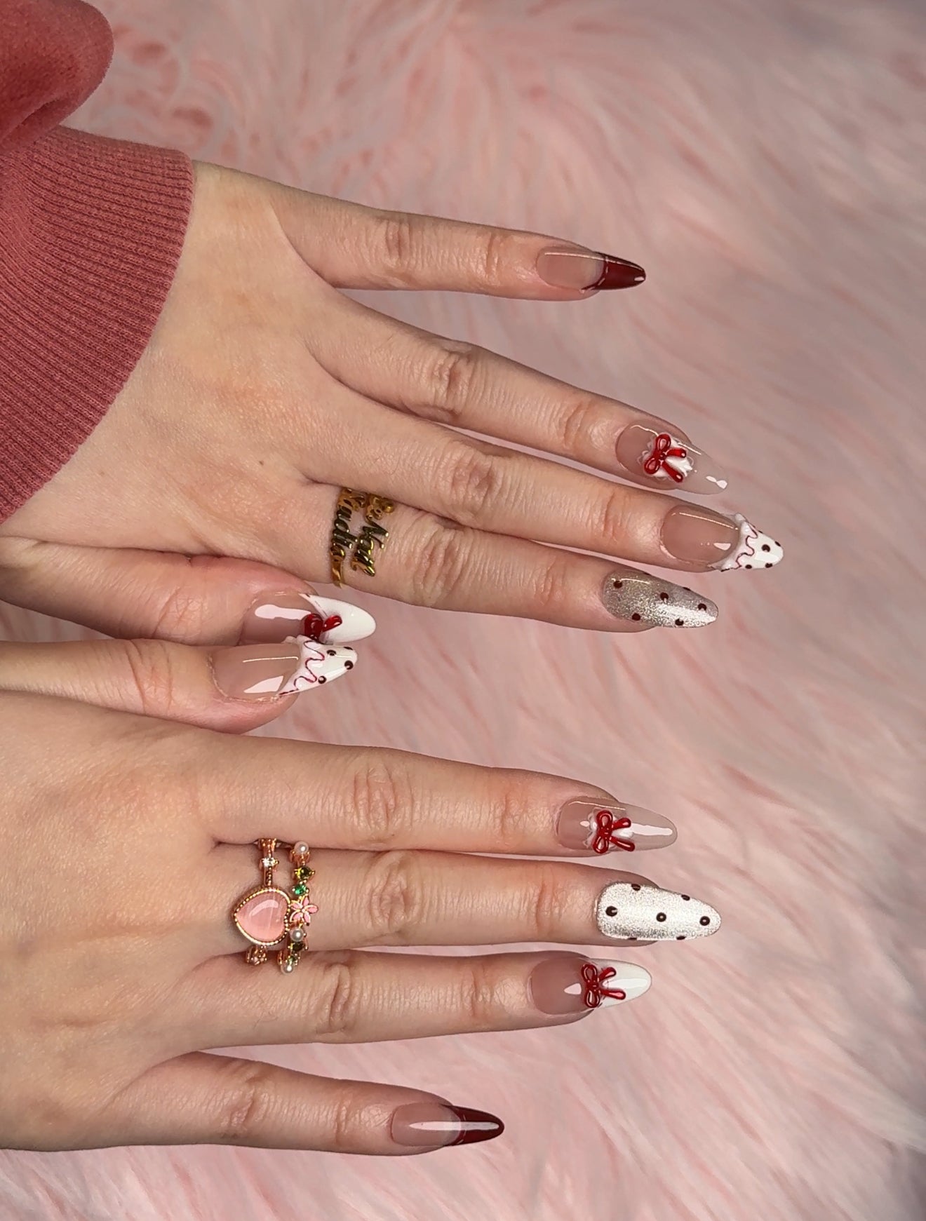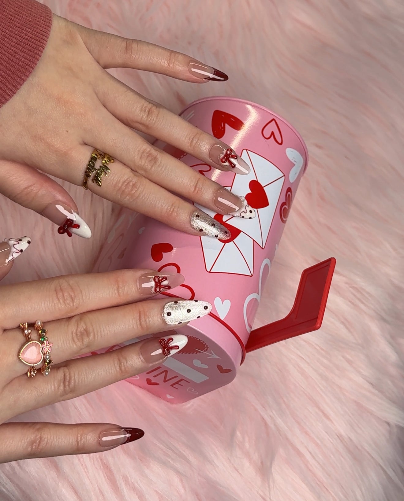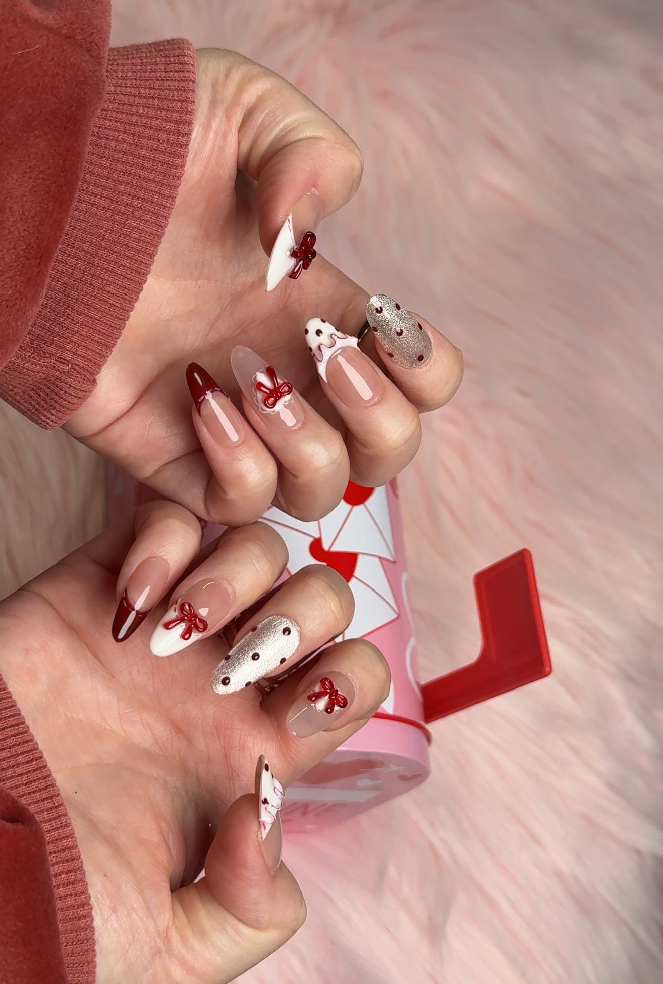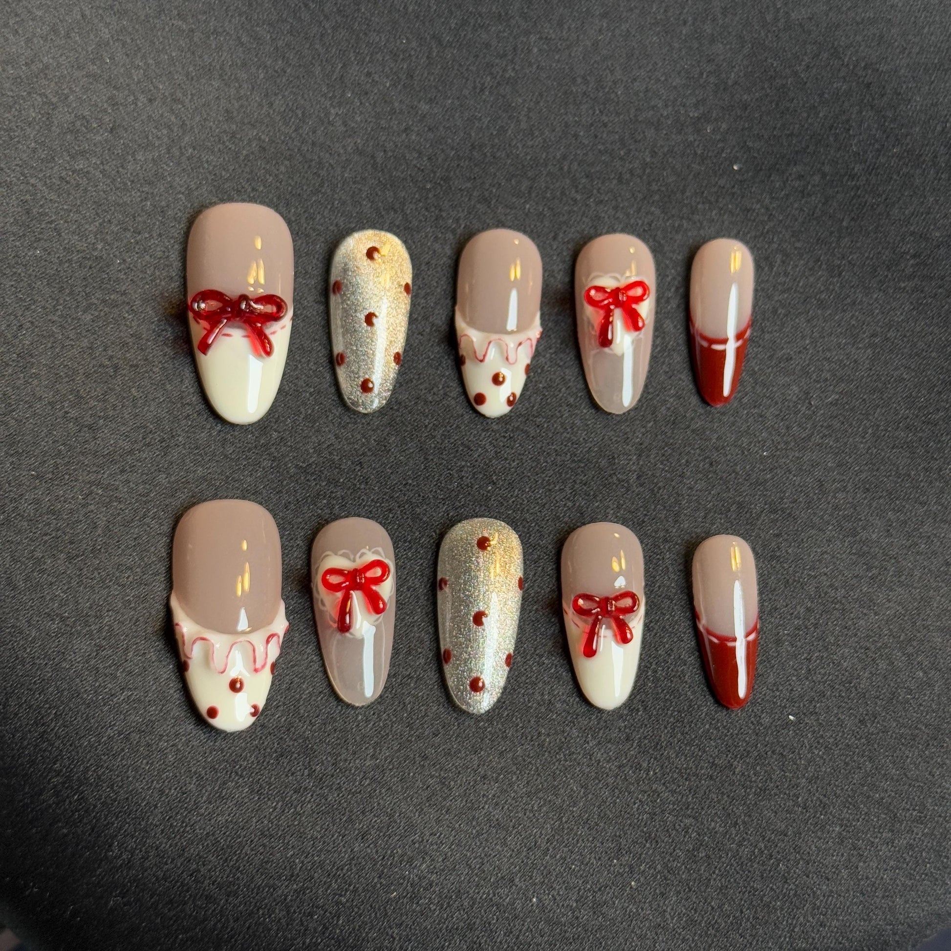 - Charming red hearts, dots, and delicate bows combined with a soft nude and white base for a romantic touch. Our handmade press-on nails are high-quality, stylish, and built to last—perfect for anyone who loves unique designs.