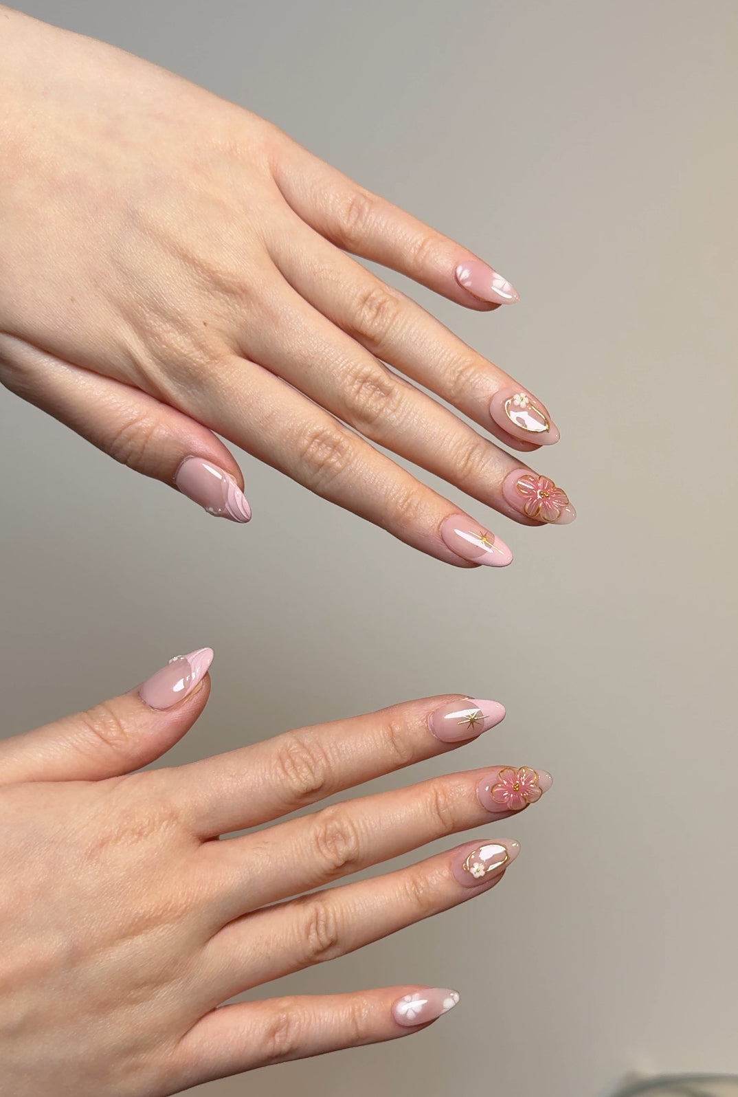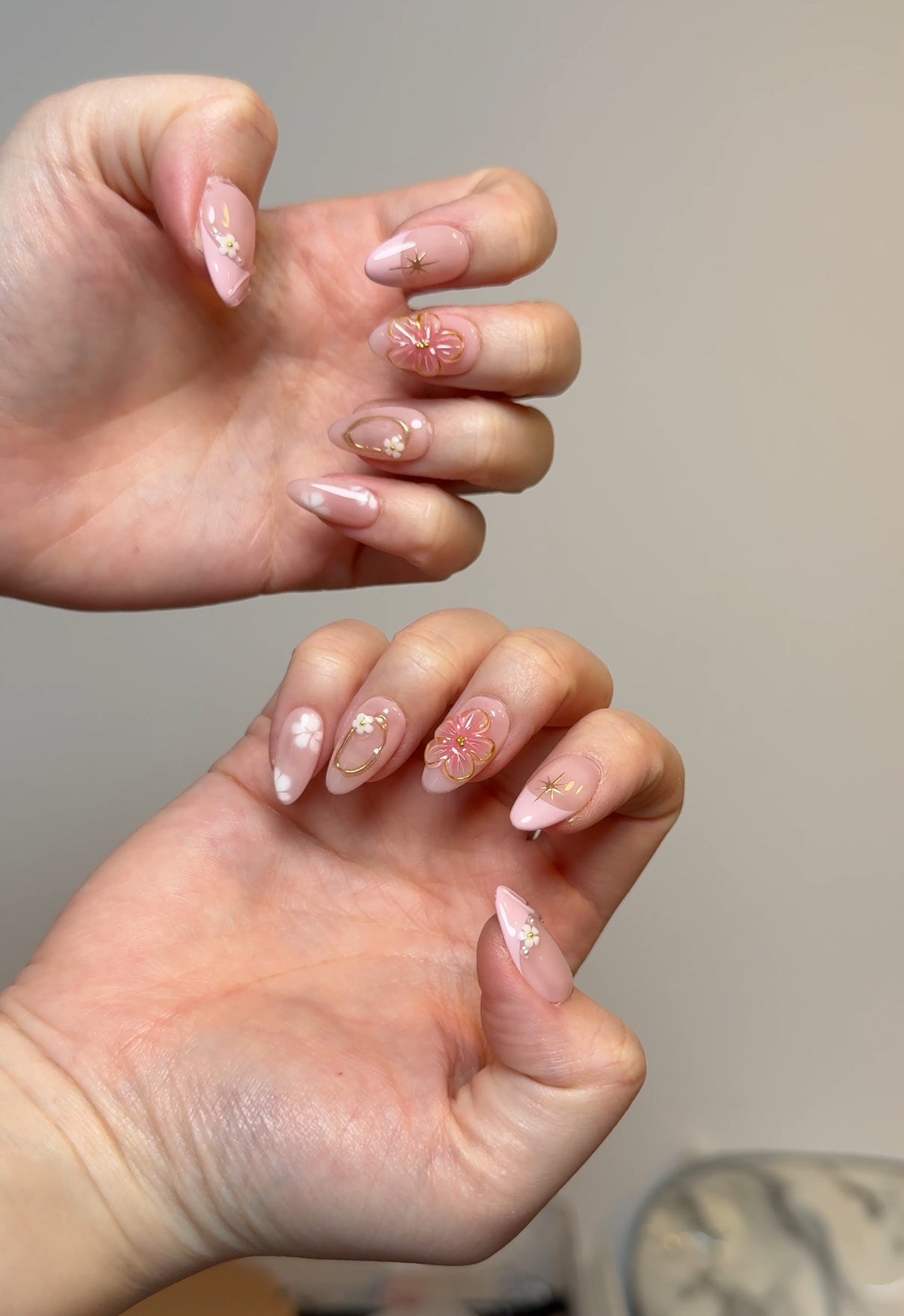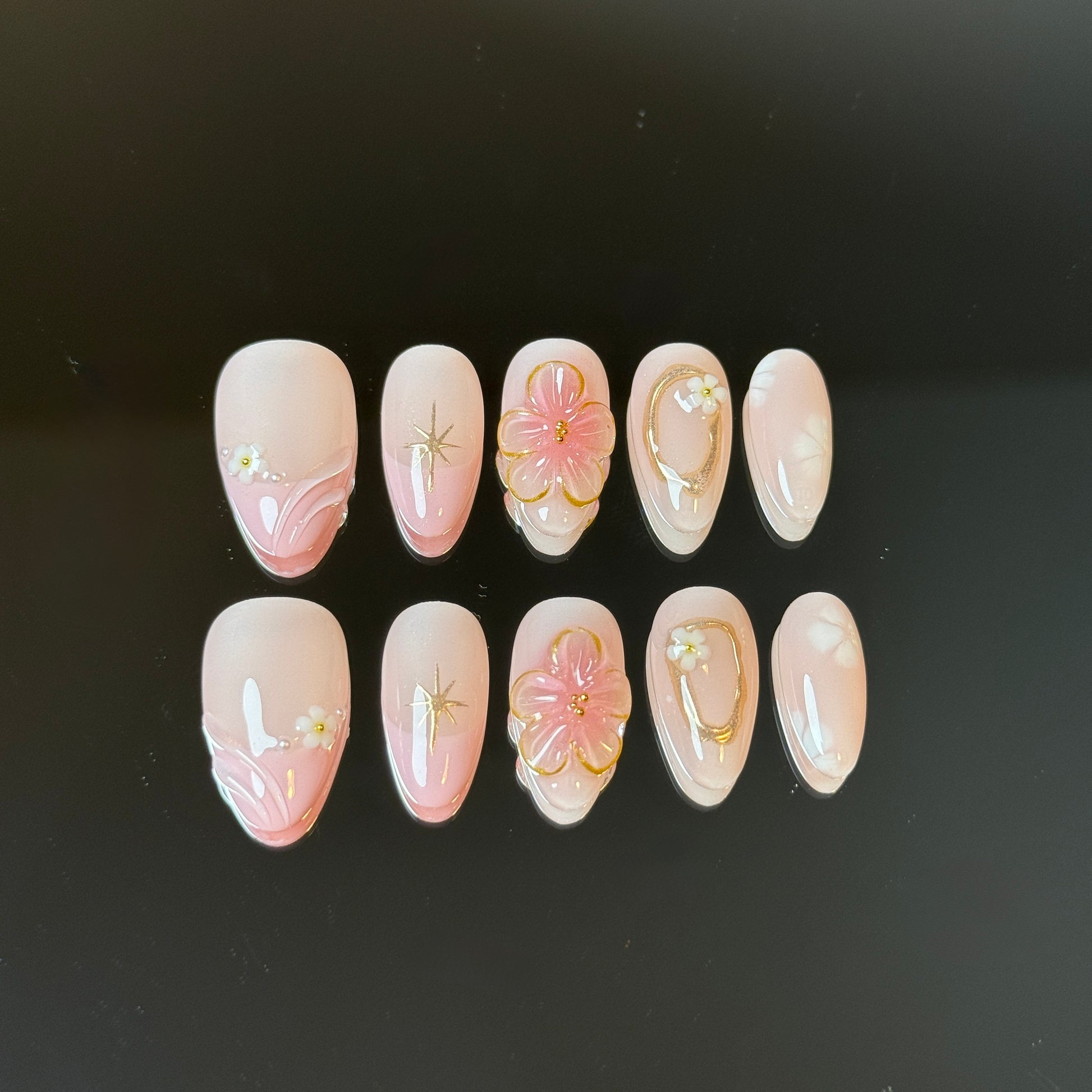 “Petal Bloom” press-on nail set is a dreamy fusion of soft pastels and delicate floral designs. Each nail features a unique combination of gentle pinks, blues, and iridescent hues, adorned with intricate floral accents and shimmering rhinestones. The elegant swirls and bows add a touch of whimsy, making this set perfect for those who love a subtle yet enchanting look. Ideal for special occasions or adding a touch of magic to everyday wear.